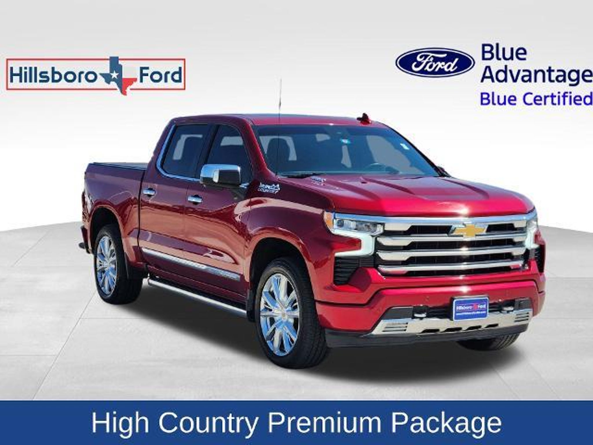 Take your adventures further with our Diesel powered 2023 Chevrolet Silverado 1500 High Country Crew Cab 4X4 to enjoy superior strength and style in Radiant Red Tintcoat! Motivated by a TurboCharged 3.0 Liter DuraMax Diesel 6 Cylinder offering 305hp and 495lb-ft of torque to a 10 Speed Automatic transmission. This Four Wheel Drive truck flaunts commanding capability with a high-capacity suspension and Autotrac 2-speed transfer case, and it sees nearly 27mpg on the highway. Our Silverado is designed to draw a crowd with LED lighting, fog lamps, chrome assist steps, 20-inch alloy wheels, a Chevytec spray-on bedliner, running boards, tonneau cover, a sunroof, perimeter lighting, and power up/down tailgate. Once inside, our High Country cabin has luxuries like heated/ventilated leather power front seats, heated rear seats, a heated leather power steering wheel, dual-zone automatic climate control, a power sliding rear window, remote start, and keyless access/ignition. The eye-friendly infotainment system adds a 12-inch driver display, a 13.4-inch touchscreen, Google Built-In, voice control, Bose audio, WiFi compatibility, wireless Android Auto/Apple CarPlay, Bluetooth, and wireless charging. Chevrolet brings peace of mind with automatic braking, forward collision warning, lane-keeping assistance, HD surround vision, trailer-capable blind-spot monitoring, a bed-view camera, and more. Now check out our Silverado High Country for yourself and take charge of your world! Save this Page and Call for Availability. We Know You Will Enjoy Your Hillsboro Ford Test Drive Towards Ownership! Clean CARFAX. CARFAX One-Owner. Hillsboro Ford is conveniently located on the frontage road of Interstate 35 and only 30 miles South of Waxahachie and 30 miles North of Waco. It takes less than 30 minutes to drive to our dealership from Whitney, Midlothian and Cleburne. Make the short trip to buy your new 2023 Chevrolet Silverado 1500 High Country today and have it parked in your driveway tonight! 22/27 City/Highway MPG Hillsboro Ford has been in operation since the 1930s. Visit us today and find out for yourself why our reputation has stood the test of time. Our expert sales, service and parts personnel are standing by and waiting to assist you. Drive the short country mile down the road to Hillsboro Ford today. Find out for yourself why our neighbors in Waco, Waxahachie, Whitney, Cleburne and Midlothian have been shopping with us for years. Your new 2023 Chevrolet Silverado 1500 High Country is waiting for you.