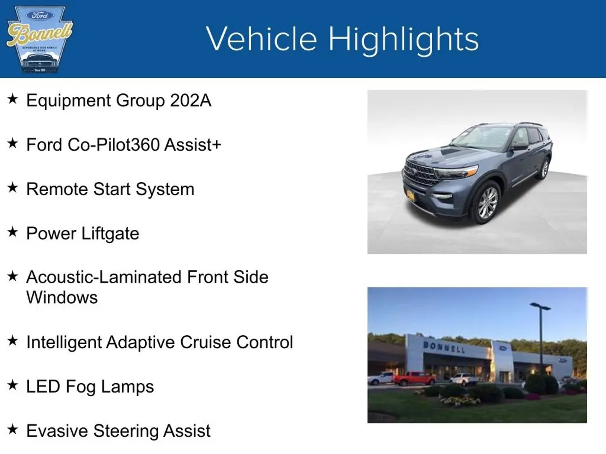 Ford Blue Advantage Gold Certified! Infinite Blue Metallic Tinted Clearcoat 2021 Ford Explorer XLT 4WD 10-Speed Automatic 2.3L EcoBoost I-4 4WD, 1st Row Heated Seats, 2nd Row 35/30/35 Bench w/E-Z Entry & Armrest, Acoustic-Laminated Front Side Windows, ActiveX Captain's Chairs, Equipment Group 202A, Evasive Steering Assist, Ford Co-Pilot360 Assist, Heated front seats, Heated Steering Wheel, Intelligent Adaptive Cruise Control, LED Fog Lamps, Power Liftgate, Remote Start System, Speed Sign Recognition, SYNC 3/Apple CarPlay/Android Auto, Voice-Activated Touchscreen Navigation System. Odometer is 38190 miles below market average! 20/27 City/Highway MPG Ford Gold Certified Details: * Powertrain Limited Warranty: 84 Month/100,000 Mile (whichever comes first) from original in-service date * Limited Warranty: 12 Month/12,000 Mile (whichever comes first) after new car warranty expires or from certified purchase date * Roadside Assistance * Vehicle History * Warranty Deductible: $100 * and 22,000 FordPass Rewards Points to use toward first two maintenance visits * 172 Point Inspection * Transferable Warranty