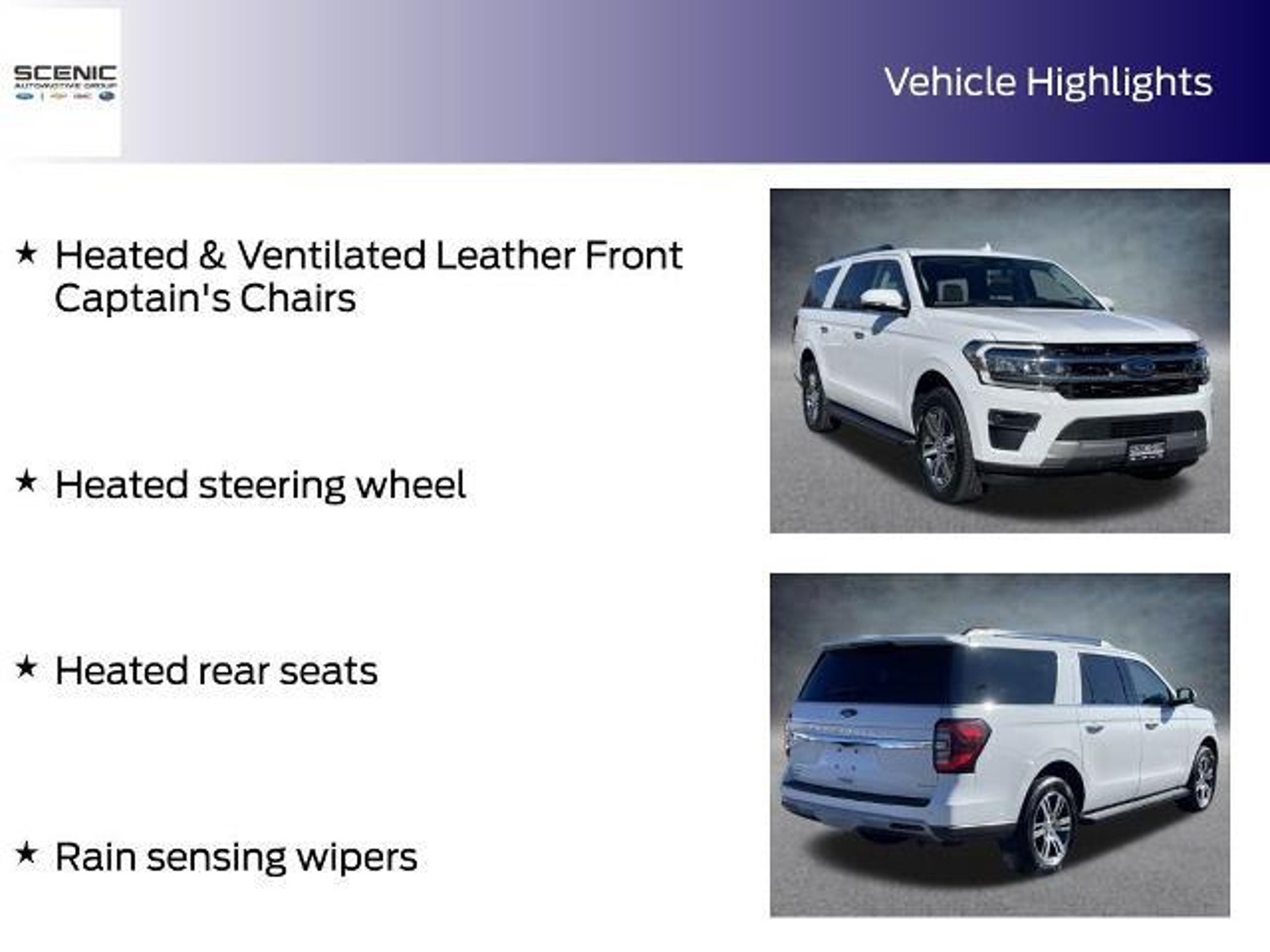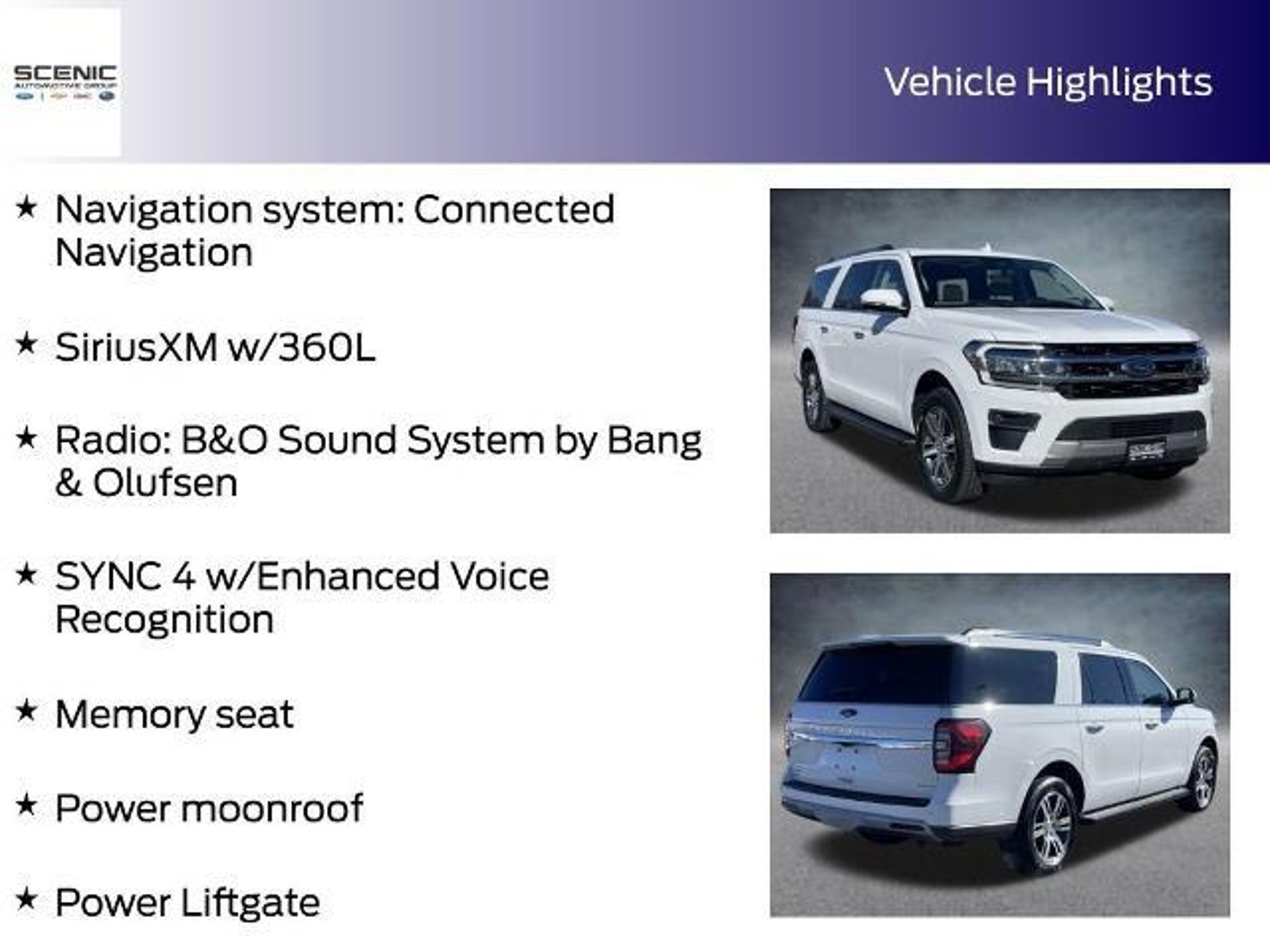 The 2024 Ford Expedition Max Limited in Oxford White brings together commanding power, premium comfort, and advanced technology in a full-size SUV designed for modern family travel. Under the hood, its EcoBoost 3.5L V6 GTDi DOHC 24V Twin Turbocharged engine delivers impressive performance with smooth, confident acceleration, paired with a 10-speed automatic transmission and 4WD for effortless control in any condition. The expansive Oxford White exterior reflects a blend of sophistication and strength, while the spacious interior, finished in Sandstone leather, creates an inviting cabin for every passenger. Heated and ventilated leather front captains chairs, heated rear seats, and a heated steering wheel ensure comfort in every season, while a memory seat system keeps your personalized settings ready at a touch. Technology takes center stage with the B&O Sound System by Bang & Olufsen, delivering rich, clear audio throughout the cabin. The Connected Navigation system provides intuitive route guidance, while SYNC 4 with Enhanced Voice Recognition keeps you seamlessly connected on the go. A power liftgate and power moonroof add convenience and openness to the driving experience, while rain-sensing wipers and SiriusXM with 360L enhance everyday practicality and entertainment. Refined yet capable, the 2024 Expedition Max Limited stands as a sophisticated SUV built to elevate every journey, whether its a weekend getaway or a cross-country adventure. Thank you for choosing Scenic Automotive as your next destination to purchase a vehicle. We have been in business for over 65 years serving the local community. We are family owned and local! We also serve the Southern Virginia community, Greensboro, Winston-Salem, and all the way out to Asheville and into East Tennessee! Please visit us online at www.scenicmotors.com or www.scenicford.com.