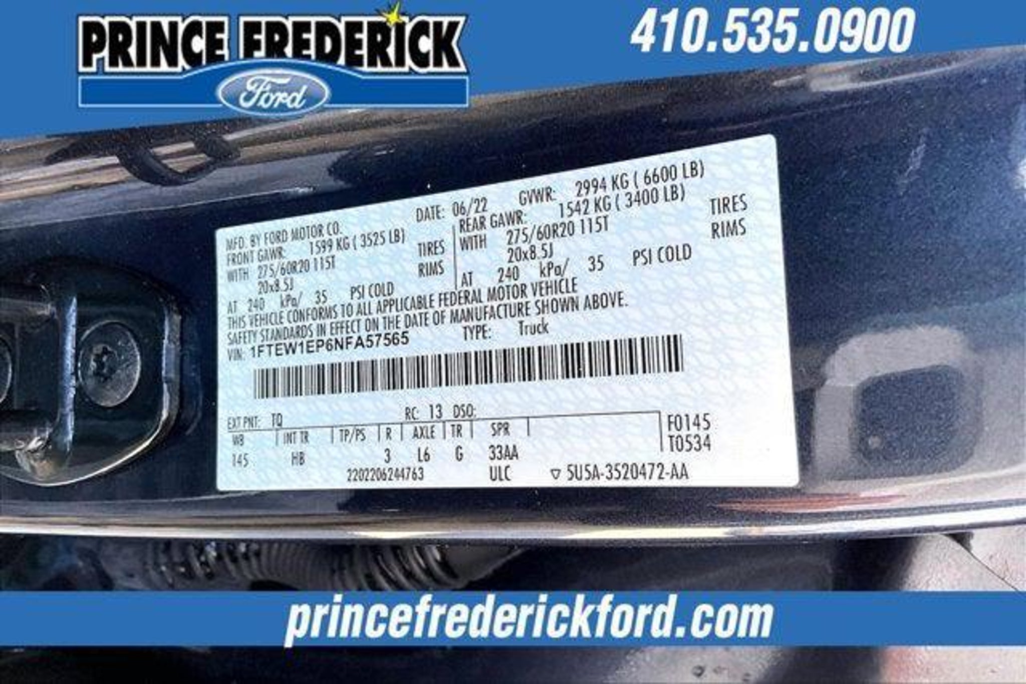 2022 Ford F-150 Lariat F-150 Lariat, 4D SuperCrew, 2.7L V6 EcoBoost, 10-Speed Automatic, 4WD, Smoked Quartz Metallic Tinted Clearcoat, Black w/Leather-Trimmed 40/Console/40 Front Seat. NO HIDDEN COSTS ! ALL VEHICLE PRICING INCLUDES COMPREHENSIVE 100 POINT MD STATE INSPECTION AND ALL RECONDITIONING FEES. We at PRINCE FREDERICK FORD are driven to provide the finest automotive purchasing and ownership experience by not only meeting the customer's expectations, but consistently exceeding them. Our goal is to become the BEST STORE FOR YOU through an unrivaled DEDICATION TO EXCELLENCE. CALL US AT 1-410-535-0900 OR VISIT US ON THE WEB AT WWW.PRINCEFREDERICK FORD.COM.We at PRINCE FREDERICK FORD are driven to provide the finest automotive purchasing and ownership experience by not only meeting the customer's expectations, but consistently exceeding them. Our goal is to become the world's largest volume dealership through an unrivaled DEDICATION TO EXCELLENCE. CALL US AT 1.410.535.0900 OR visit us on the web at WWW.PRINCEFREDERICKFORD.COM.