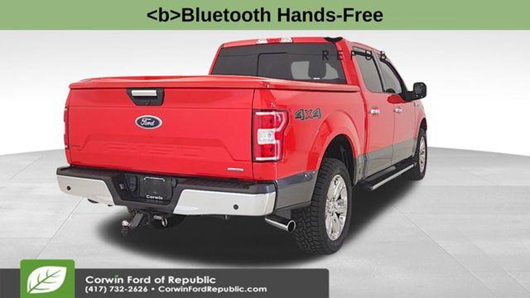 Recent Arrival! This Ford F-150 is well equipped and includes these key features and benefits, Backup Camera, *Automatic Headlights, Apple CarPlay, Android Auto, Bluetooth Hands-Free, ONE OWNER, LOCAL TRADE, 4WD, Power-Sliding Rear Window, Rear Window Defroster, Remote Start System, Steering wheel mounted audio controls. CARFAX One-Owner. Clean CARFAX. 2018 Ford F-150 XLT 4WD 10-Speed Automatic 3.5L V6 EcoBoost Race Red Awards: * 2018 KBB.com Brand Image Awards * 2018 KBB.com 10 Most Awarded Brands The BIG QUESTION is why buy from Corwin Ford Lincoln Republic. Corwin is a family owned and operated business. We have been in business for over 100 years. Our select Certified inventory takes the risk out of buying a car at the same live market price. All our preowned vehicles get 172 point inspection by certified technicians. You get a Vehicle History Report. Now that's a deal! What is Live Market Pricing? We utilize a 3rd party company, Kelly Blue Book, to help us price preowned vehicles. To not be just the best price, but the best value price. Which in turn takes the haggle out of buying a car. Saving you TIME and MONEY. Remember if it does not say Corwin on the back of the car, you've probably paid to much. We proudly serve Republic, Ozark, Nixa, Fair Grove, Pleasant Hope, Billings, Clever, Springfield, Aurora, Branson, Marshfield, and the greater Springfield Missouri area. Corwin Price does not include Admin fee of $604.00 or optional Data Dots $299.*