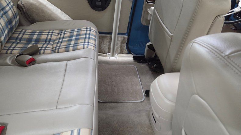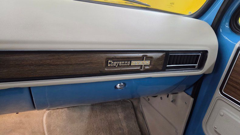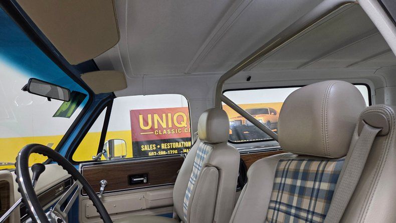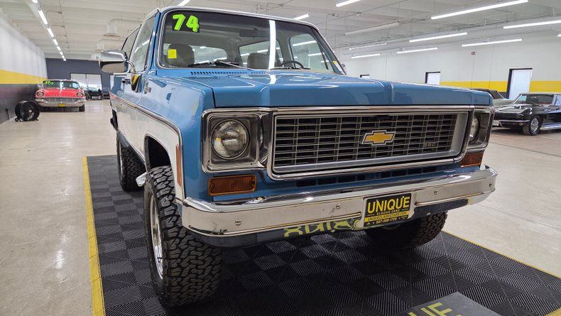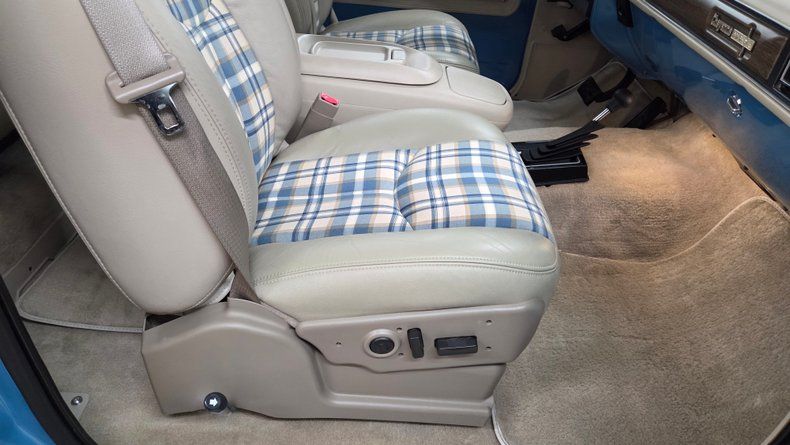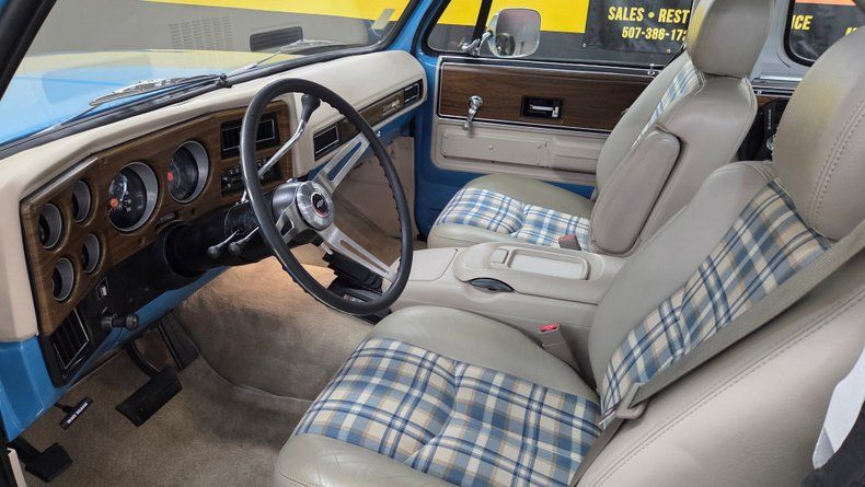 1974 Chevrolet K5 Blazer, restored and modernized with a fuel injected 5.7L Vortec V8 engine and an automatic 4L60E overdrive transmission, blending vintage style with contemporary performance. Equipped with power steering, power brakes, and COLD A/C. The exterior features a great blue and white paint combination, complemented by the chrome accents of the bumper and headlight bezels. Riding on custom retro looking 18-inch wheels wrapped in white letter BFG Goodrich All-Terrain tires with plenty of tread left. The body is in excellent condition, showing no significant dents or scratches, maintaining the original lines. Inside, a custom interior that cleverly mixes modern comfort with classic aesthetics. The seats sourced from a later model, feature a custom unique leather and cloth combination with plaid fabric inserts reminiscent of the 1970s era that compliment the paint job nicely. The passenger side front seat will tilt forward for easy entry to the rear seats. The cabin includes power seats, fold-down armrests, a center console, a tilt steering column, and a roll bar to accommodate the vehicle's removable top, which when off, leaves open air all the way to the windshield-a feature unique to only the early years of the K5 Blazer. The rear window in the tailgate is a crank down manual window and works well. Under the hood, the engine bay is very clean and well-maintained, showcasing the nicely painted modern 5.7L Vortec engine with a cold air intake. Featuring dual Borla mufflers, contributing to a pleasant exhaust note. An easy starting smooth idling, comfortable drive from this truck. Gauge readings, digital radio, and blower motor functional. Enjoyable solid throttle response, easy handling, effective brakes, and great sound.