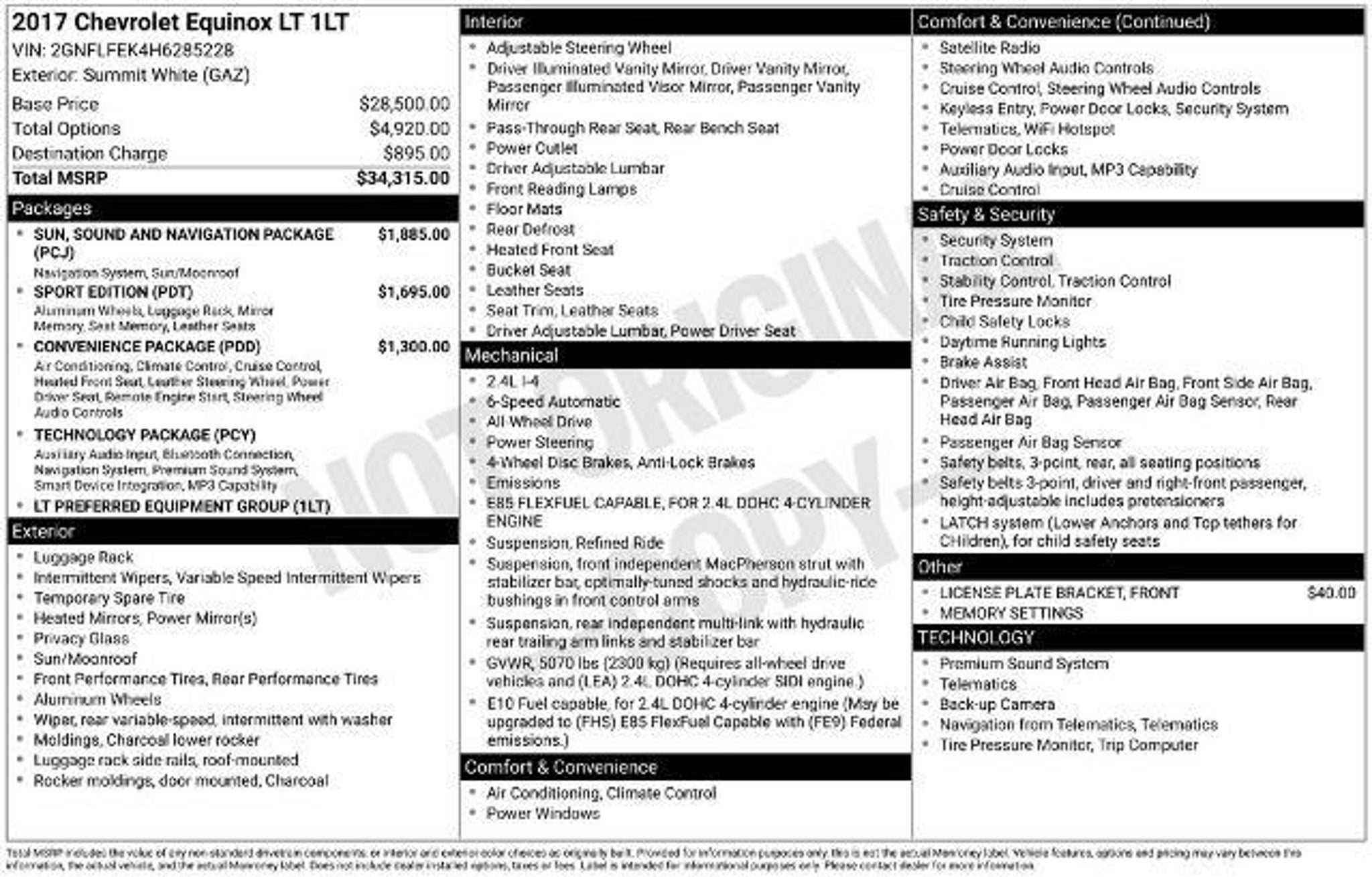 Delivering the capability of an SUV and the fuel economy of a car, our **2017**Chevrolet**Equinox**LT**AWD**Leather Seats**Bluetooth** displayed in Summit White should be at the top of your list! Powered by a 2.4 Liter 4 Cylinder that offers 182hp connected to a responsive 6 Speed Automatic transmission to allow this nimble five-passenger vehicle to own the road. This All Wheel Drive SUV scores nearly 32mpg on the highway and even offers an Eco button to maximize efficiency further. Our Equinox LT has beautiful lines, LED daytime running lights, and great-looking wheels. Slide inside our LT, and you'll feel instantly at ease and perpetually indulged with loads of legroom for optimal comfort. Chevrolet MyLink touchscreen interface, voice controls, Bluetooth phone connectivity, smartphone integration, OnStar with an available WiFi hotspot, and a great sound system with available satellite radio, auxiliary audio input, and USB are just a sampling of what awaits you in this well-appointed cabin. Our Chevrolet has received excellent safety scores. It is committed to excellence with a steel safety cage, ABS, and StabiliTrak to help you stay grounded in all road and weather conditions. With the available OnStar's automatic crash response, you'll also have peace of mind. A practically perfect blend of efficiency, utility, space, and style, this Equinox LT might be the best decision you'll make this year! Save this Page and Call for Availability. We Know You Will Enjoy Your Test Drive Towards Ownership!