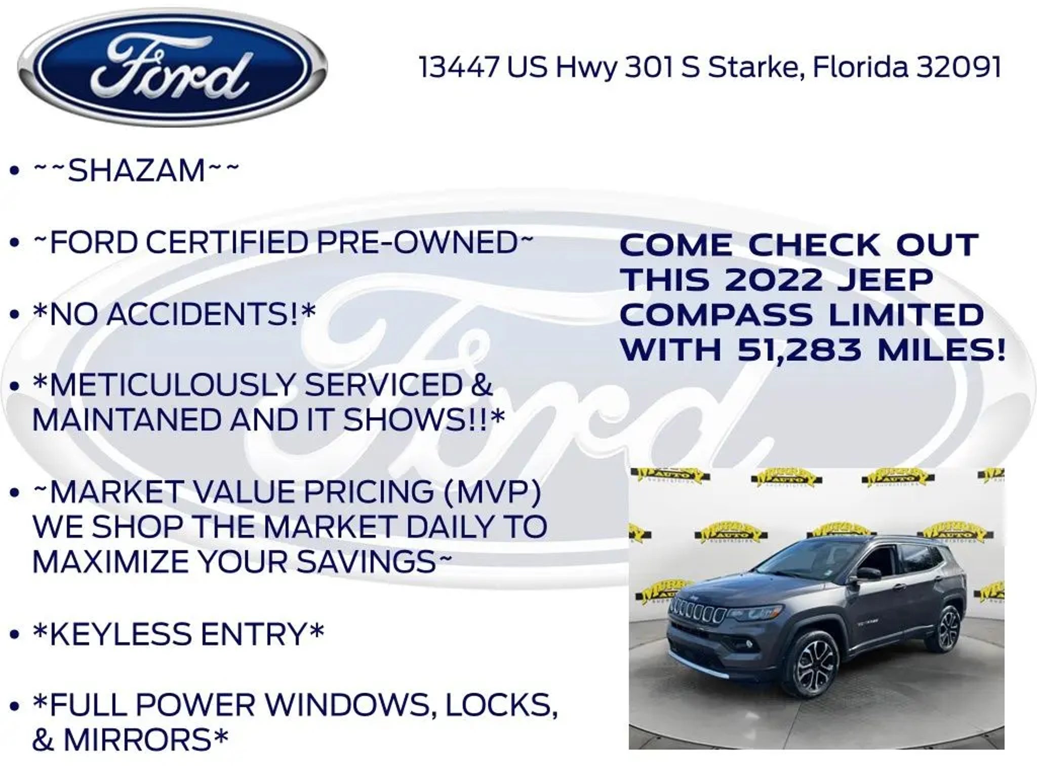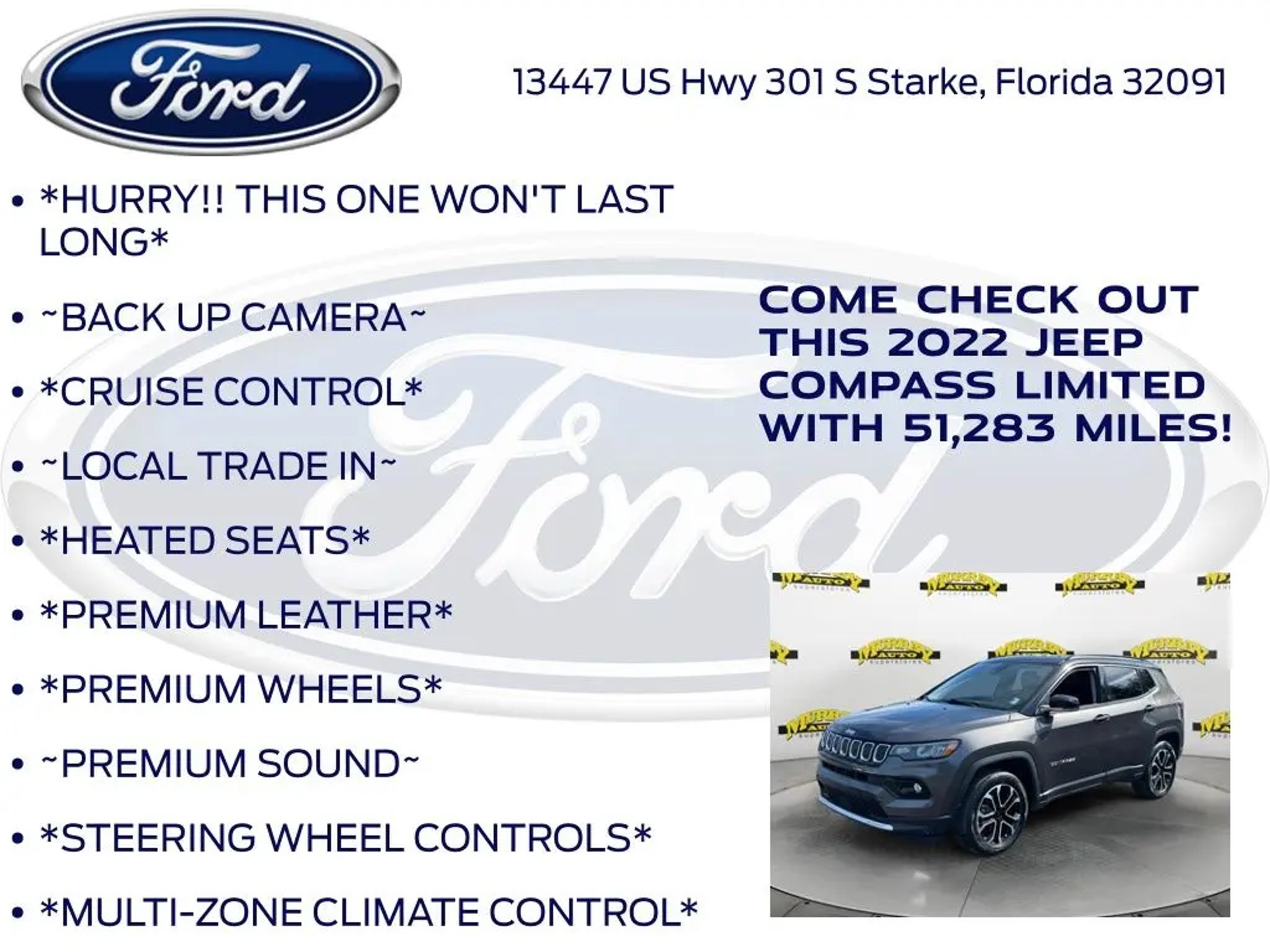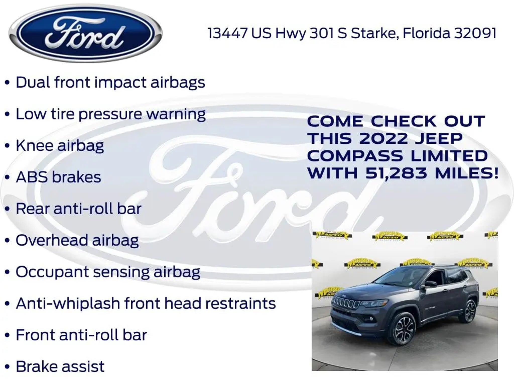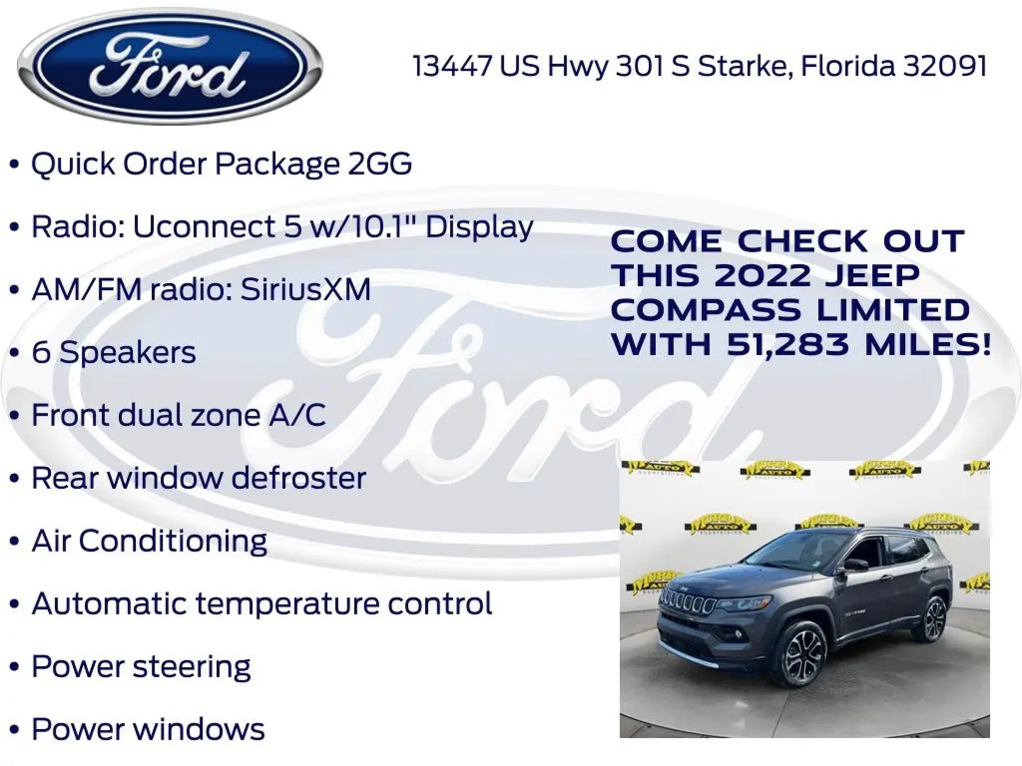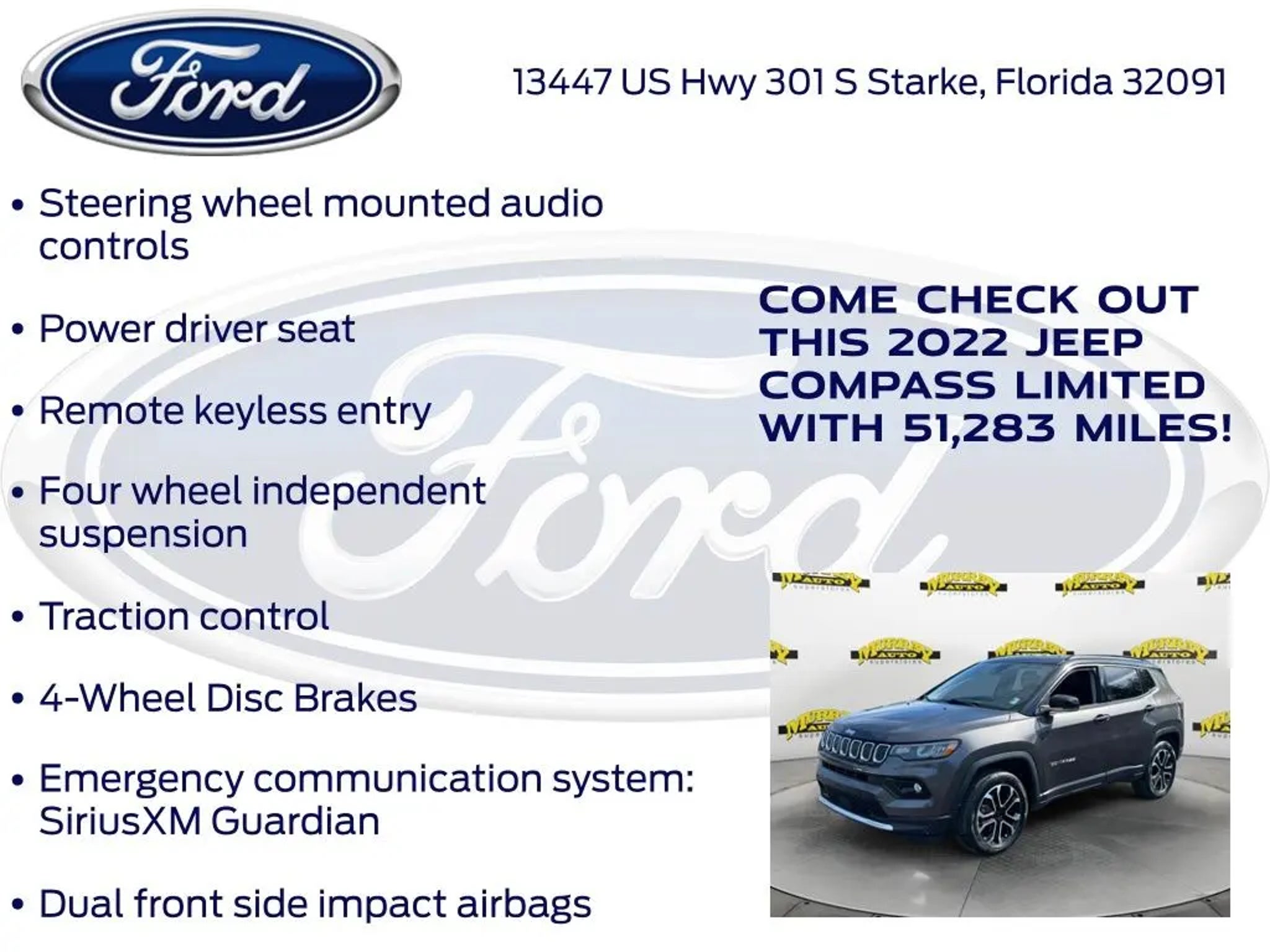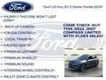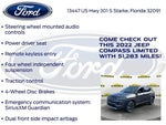 Priced below KBB Fair Purchase Price! Murray Ford Superstore of Starke is proud to offer this charming-looking 2022 Jeep Compass in Granite Crystal Metallic Clearcoat This vehicle is readily available and comes with the following Quick Order Package 2GG, Ford Blue Advantage: Blue Certified Certified, 4WD, 10.1 Touchscreen Display, 3.73 Axle Ratio, 4-Wheel Disc Brakes, 6 Speakers, ABS brakes, Air Conditioning, Alloy wheels, AM/FM radio: SiriusXM, Anti-whiplash front head restraints, Auto High-beam Headlights, Auto-dimming Rear-View mirror, Automatic temperature control, Brake assist, Bumpers: body-color, Compass, Delay-off headlights, Disassociated Touchscreen Display, Driver door bin, Driver vanity mirror, Dual front impact airbags, Dual front side impact airbags, Electronic Stability Control, Emergency communication system: SiriusXM Guardian, Four wheel independent suspension, Front anti-roll bar, Front Bucket Seats, Front Center Armrest w/Storage, Front dual zone A/C, Front fog lights, Front reading lights, Fully automatic headlights, Global Telematics Box Module (TBM), Gloss Black Exterior Mirrors, Heated door mirrors, Heated front seats, Heated steering wheel, Illuminated entry, Knee airbag, Leather Shift Knob, Leather Trimmed Bucket Seats, Low tire pressure warning, Occupant sensing airbag, Outside temperature display, Overhead airbag, Overhead console, Panic alarm, ParkView Rear Back-Up Camera, Passenger door bin, Passenger vanity mirror, Power door mirrors, Power driver seat, Power steering, Power windows, Radio: Uconnect 5 w/10.1 Display, Rain sensing wipers, Rear anti-roll bar, Rear seat center armrest, Rear window defroster, Rear window wiper, Remote keyless entry, Roof rack: rails only, Security system, Speed control, Split folding rear seat, Spoiler, Steering wheel mounted audio controls, Tachometer, Telescoping steering wheel, Tilt steering wheel, Traction control, Trip computer, Turn signal indicator mirrors, Variably intermittent wipers, and Wheels: 18 x 7 Painted Diamond Cut Aluminum; Certification Program Details: Ford Blue Advantage: Blue Certified * 139 Point Inspection * Transferable Warranty * Vehicle History * Warranty Deductible: $100 * Roadside Assistance * Limited Warranty: 3 Month/4,000 Mile (whichever comes first) after new car warranty expires or from certified purchase date * and 11,000 FordPass Rewards Points to use toward first maintenance visit 15 Year 150,000 mile warranty at no cost applies to all vehicles excluding Transit Vans, DRW Trucks, any SVT Models, or similar vehicles. See sales for details! All vehicles will have a $999.00 dealer fee added to the total sale price (excludes A,Z,D, and X plan customers). Taxes, tag, title fees and a $125 Electronic filling fee will be added to all vehicles in accordance with state laws of customers registering address. *** We make every effort to provide you with the most accurate, up-to-the-minute information, however it is your responsibility to verify with the Dealer that all details listed and installed options are accurate for this specific vehicle. To ensure accuracy, please contact the dealership to verify the exact options, features and programs that are included and are available for this specific vehicle prior to purchase. Price Does not Include any dealer installed options or accessories. *Dealer Discount includes $1000 Finance Bonus Cash and $1000 Trade-In Bonus Cash*