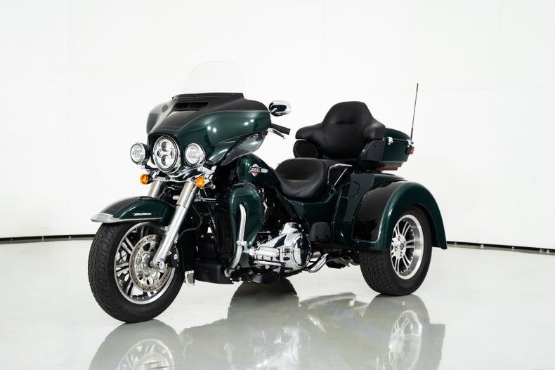 Finished in Alpine Green and Black with black leather seats, this Harley-Davidson trike rides on aluminum wheels wrapped in Dunlop radial tires. With only 2,371 original miles from its single owner, it's barely broken in and ready for the road.