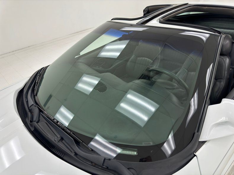 A WS6 style hood has been added to this car which adds aggressive and functional ram air dual scoops that protrude higher over the hood than that stock version would in 1997. The nosepiece houses a pair of inset fog lights and begins the pinstripe coverage with a design in the center and a stripe that follows the shape of the scoops and rides next to them almost to the cowl. A forward leaning C-pillar after the T-tops combines with a sweeping rear wing to create a look that defines this F-body sports car. In Trans Am tradition, the taillight flanks a continuous black bar across the back over a smooth bumper cover that is sculpted to accept quad exhaust tips. Pinstripes run over the front fender to the door, break, and then pick up to ride just below the shoulder line and on the deck lid. Another one rides the midline of the door, visually connecting the bumper cover seams front and rear. 16-inch 5spoke wheels wear 245/50ZR16 tires with a late 2021 date code. Imperfections include peeling paint and chin scrapes on the nose, flex cracks on that piece as well, and various scuffs and scratches on the body. There are some mismatched shades of white and the headliner that faces up under the T-tops has holes through wear and exposure.