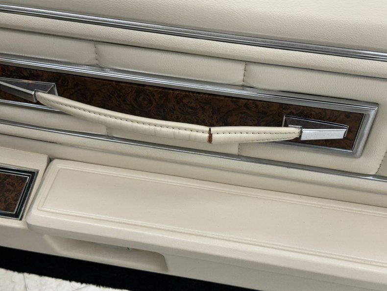 Luxurious door panels are appointed with white leather inserts, woodgrain applique, and metallic switches. There is plenty of wear on these doors from minor discoloration to tears in the door pull strap covering, to some separation of the plastic panels. White leather covers the front bucket seats in a Chesterfield style design where buttons form pillowy squares. There's compression on the driver's seat, some patina creases, and some discoloration. The rear seat squares remain full looking, and the seams could benefit from some deep cleaning. As is, the luxury in back rivals a limousine and affords passengers some privacy with just a small opera window for exposure. The 3 spoke steering wheel leads to a dash panel completely covered with woodgrain applique and where every feature is square and housing dials with needles sweeping the square. If you've ever wondered how to get a circle peg into a square hole, here's your answer. Burlwood applique is used as a framing for the A/C control panel, AM/FM/Cassette, and other switches and it's all in very good condition mounted to a richly colored plastic dash. Plush black carpet covers the floor in "toes deep" luxury and the white headliner above is in great shape and house shoulder belts clipped to the ceiling.
