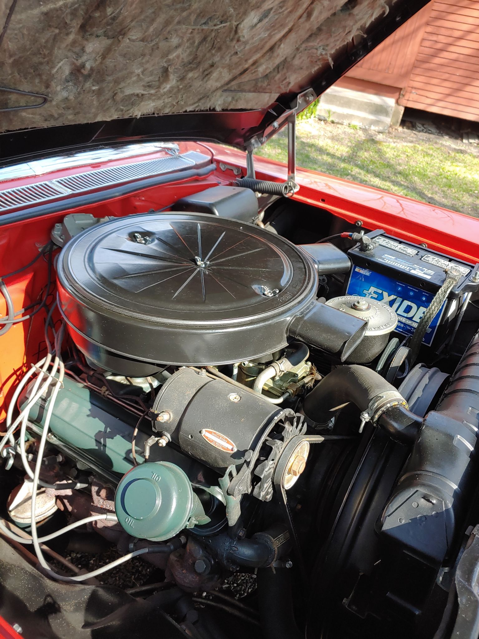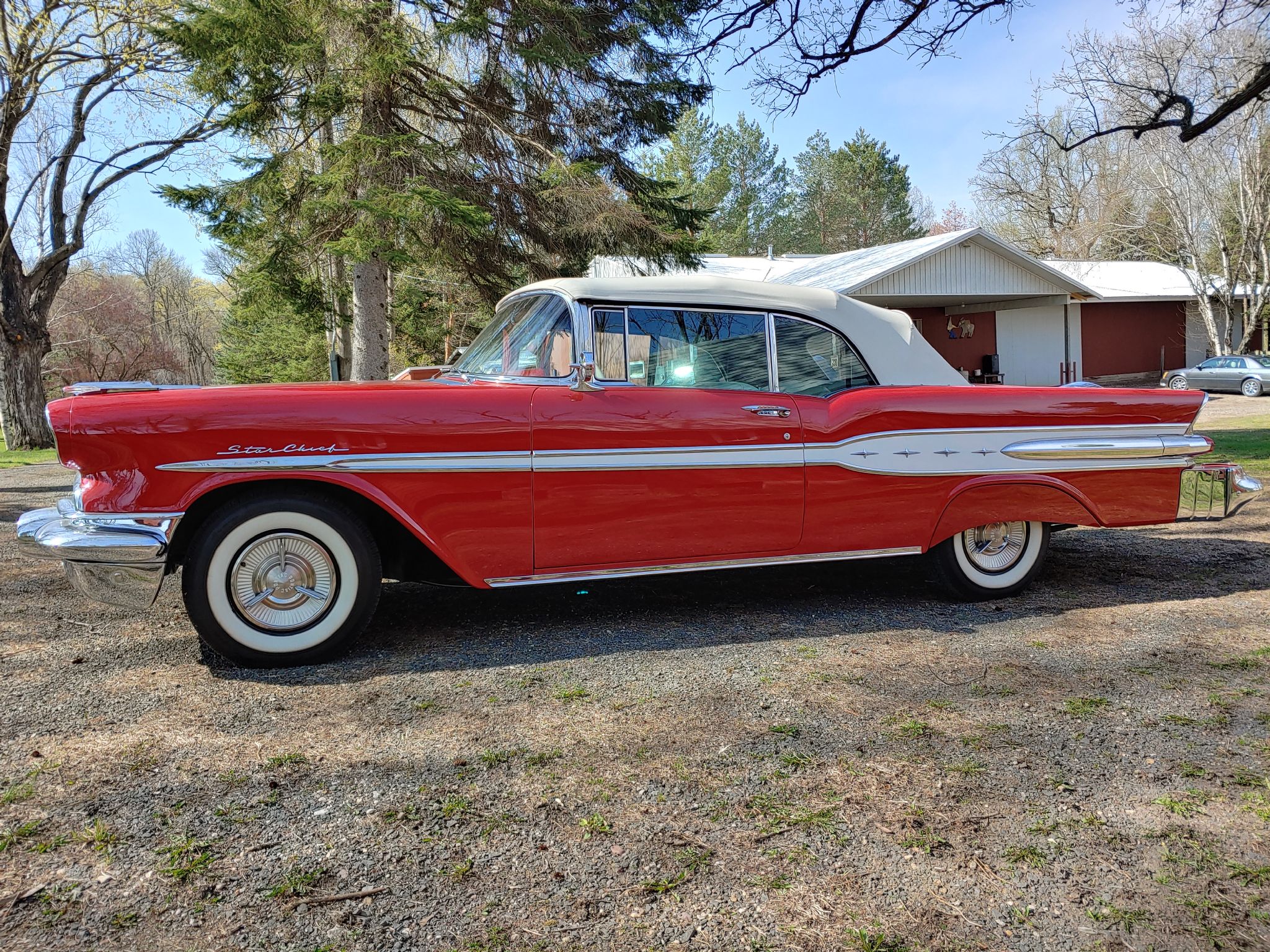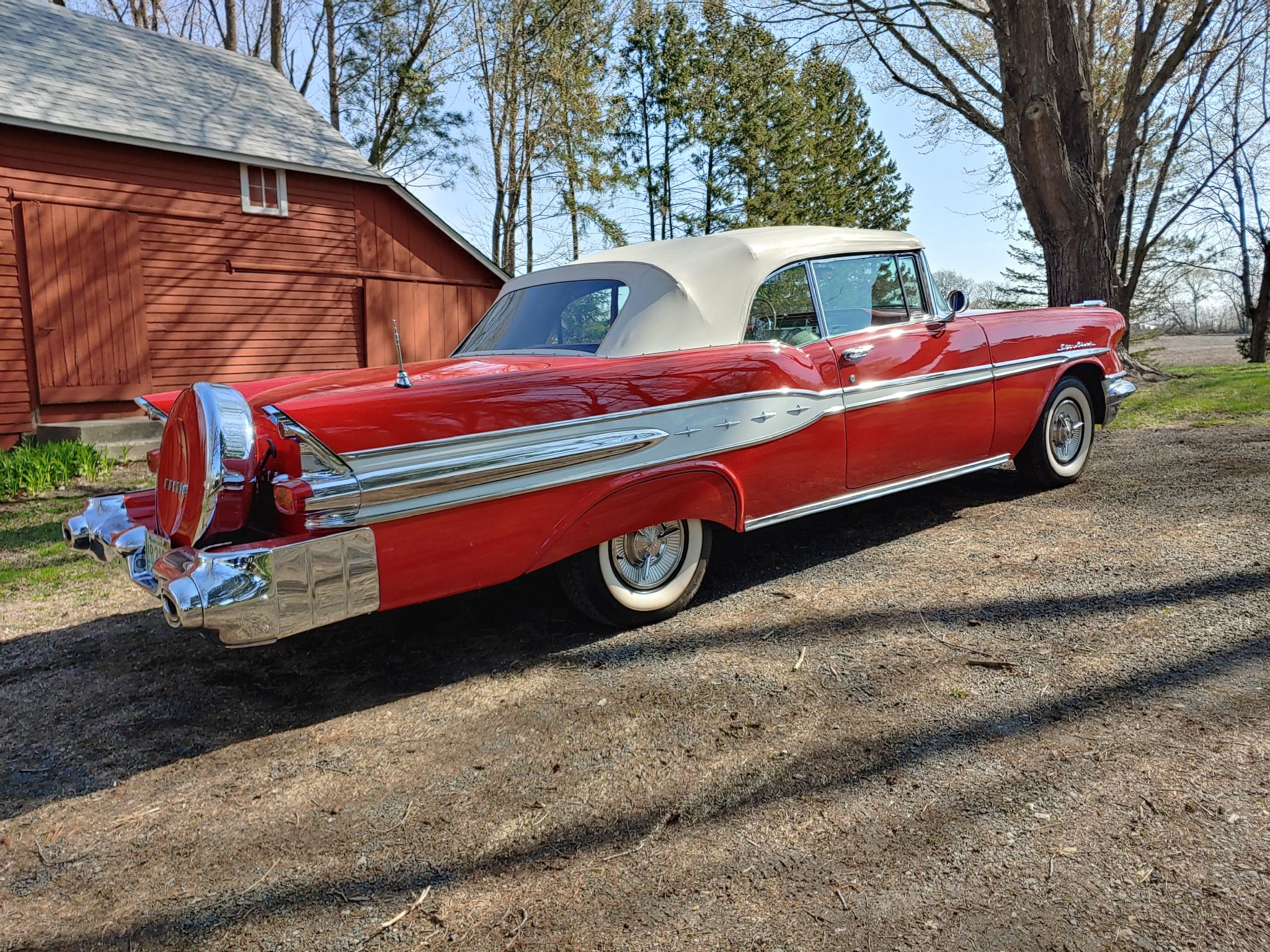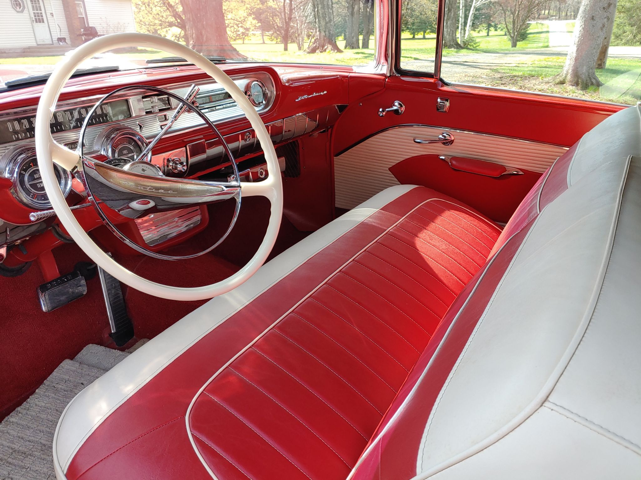 Tartan Red and White, power White soft top, vinyl Red/White interior, 347ci, 3 carb, 4 speed automatic transmission, Continental kit, radial tires, 3 bar spinner hubcaps, PB, AM/FM radio, power seats, power rear antenna, PS, PB, PW, dual exhaust, fender skirts, Kleenex holder, heater, tinted glass, dual o/s mirrors, electric windshield wipers, electric clock, back up lights, license plate chrome, glove box manual, 1400 miles since frame off restoration. George McNeilus 507-269-9870.