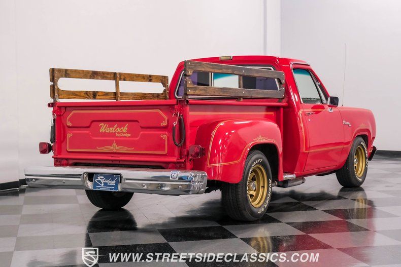 This 1979 Dodge D150 Warlock Tribute showcases a bold red paint job. Gold decals adorn the body, paying tribute to the iconic Warlock design. The truck rolls on 15" gold-painted rims wrapped in Avenger G/T 235/70R15 tires. A real wood bed adds authentic utility, while a sliding rear window and new front bumper complete the exterior upgrades. This D150's transformation from stock to custom creates a unique blend of classic truck styling and modern flair.