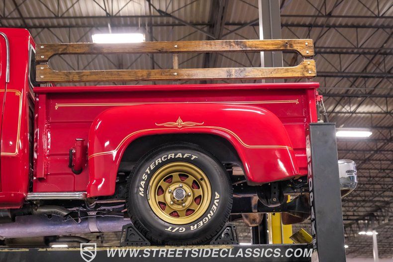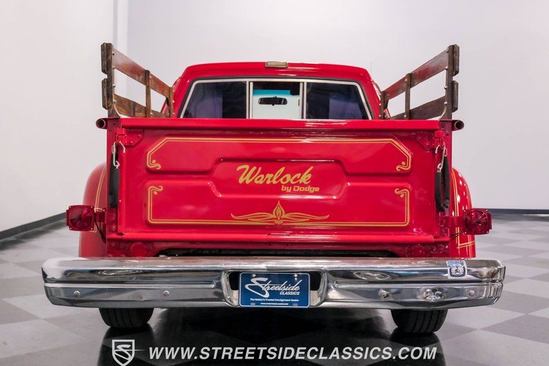 HIGHLIGHTS: 360 V8 Engine (originally 318) Edelbrock 4-Barrel Carburetor RV Cam A727 Torqueflite 3-Speed Automatic Transmission Power Steering Power Front Disc Brakes Flowmaster Dual Exhaust Red Paint w/ Gold Warlock Tribute Decals 15" Wheels in Avenger G/T 235/70R15 Tires Real Wood Bed Sliding Rear Window New Front Bumper Black Interior with Bench Seat Aftermarket Steering Wheel Dual AM/FM Radio with USB and AUX Ports