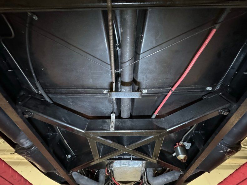 Tubular frame construction and clean surfaces are found underneath this long car, with no surface rust nor errant fluids anywhere. We note and photograph a broken fiberglass splash guard near the front but no other notable imperfections. The dual exhaust comes from headers, sans catalytic converters, to meet FlowMaster mufflers, then run down the side to exit under the car. Coil spring suspension is up front while a transverse leaf spring and suspension that resemble C4 Corvette components in back.