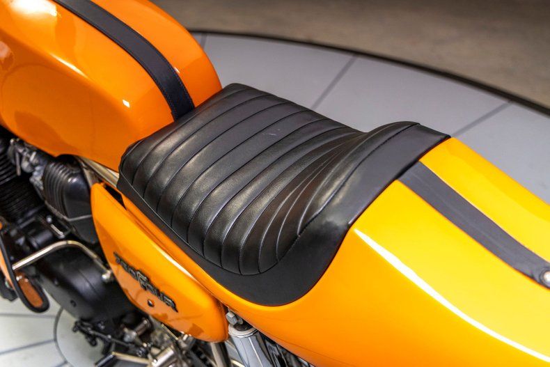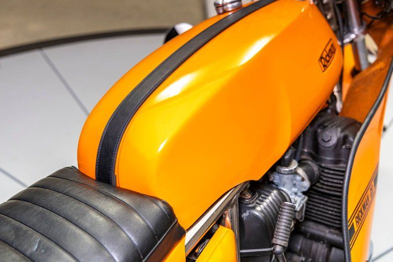 The aerodynamic Rickman CR750 body kit, featuring a tasteful leather center strap, gives the bike a sleek, race-ready appearance. This particular example has been recently serviced, including new tires, ensuring that it's ready to hit the road. The paint is in excellent condition, with minimal signs of wear, reflecting its well-preserved status.
