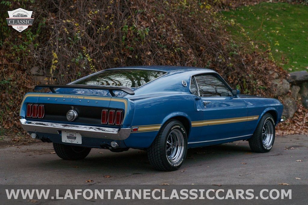 LaFontaine Classic Cars is excited to offer: Acapulco Blue over Black AbsolutelyStunning 69' Mach 1 S Code!This car was sourced from an Idaho based enthusiast and collector whosegoal was to add the modern creature comforts while stillkeeping the factory appearance! Restoration highlights include: Refinishing the body in the original Acapulco Blue paint and replacing or restoring almost every piece inside the interior resulting in the "like new" condition you see it in today. Under the hood boasts a beautifullydressed and Date Coded correct 390c.i. FE (9G17). It features a Holley Brawler 4bbl an aluminum performer intake manifold billet front drive and is cooled by Dual Electric Fans. The whole car was completely rewired from front to back with an American Autowire harness!The interior features bucket seats with new TMI covers along with a re-covered rear bench all trimmed in the correct black vinyl. The dash pad door panels center console headliner and carpet have also been replaced. New trim bright work glass felts and seals were also fitted! A "Classic Air" under-dash A/C unit Dakota digital gauges and the Ididit tilt column topped with a 3-spoke Shelby style wheel bring the car into the modernera without losing the charm! The cherry on top is the Bluetooth enhanced factory Philco Radio!