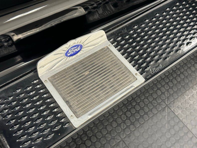 Swinging open the passenger's door, (trust me, it's much easier to enter from this side), and we are met with lightly textured basic black vinyl door panels with a simple black steel actuator. A fat black rimmed 4 spoke steering wheel with timing and throttle controls sits atop the column in front is a full metal jacket black steel dash. A simple, spartan design with only an ampere gauge to monitor on this dash and a simple combination headlight and ignition switch, and chrome courtesy light. Providing the seating is a black vinyl bench seat finished with a buttoned tuck and roll pattern and looking just fab. A simple black vinyl Ford logoed floor mat covers the wooden floors and wraps up our interior tour.