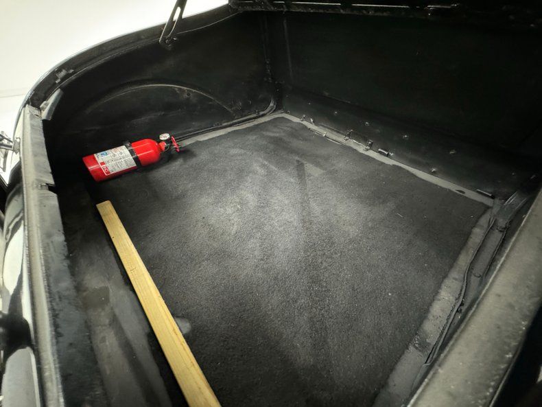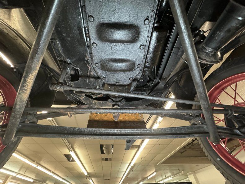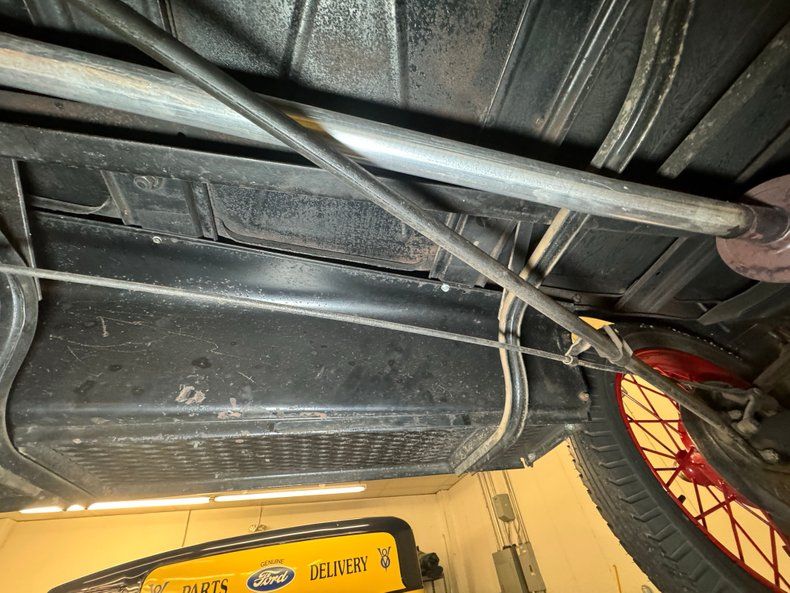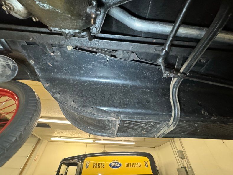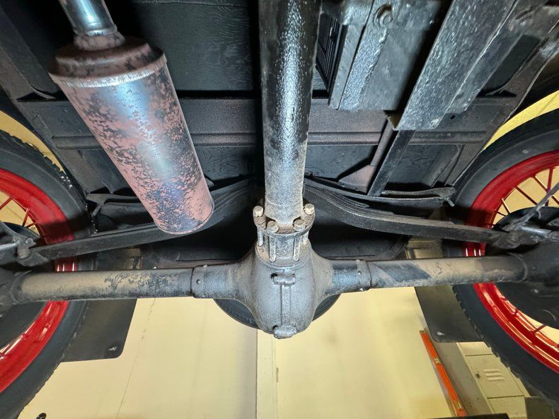 Solid black steel makes up the frame and supports black body hangers with just a few spots of surface rust due to chip offs on the underside of the fenders and running boards. A mix of black steel and wood makes up the flooring and is in good shape. Transverse leaf springs provide the suspension front and rear and rear mechanical drum brakes are on. A stock style single exhaust system handles the removal of spent fossils. All looking good and original down below.