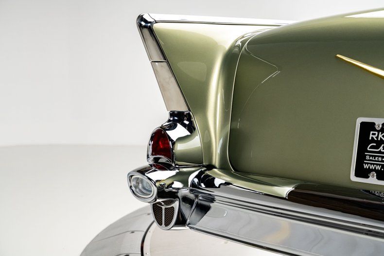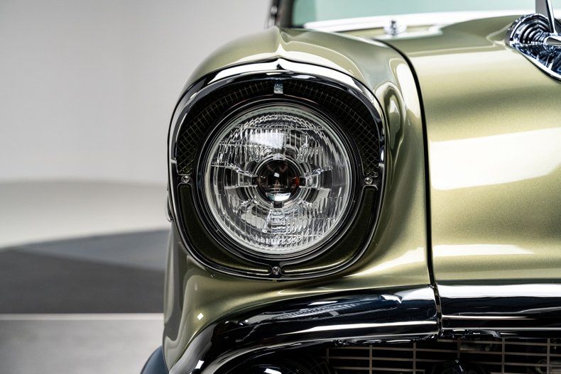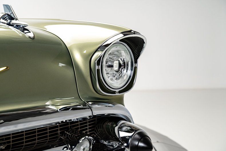 The lines of this '57 Bel Air are nothing short of breathtaking, with an expertly restored and perfected body finished in a custom two-tone green paint that perfectly complements its aggressive stance. Every curve, every detail, has been honed to perfection to create a car that's as visually striking as it is mechanically precise.