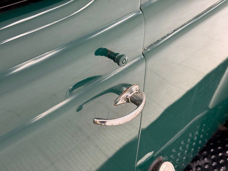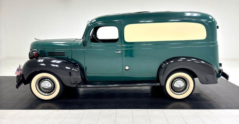 Exterior With the front of the truck looking very similar to the Dodge cars of the day, it is well preserved with all the correct chrome trimmings, a rounded V grille with horizontal wings stretching towards the big round fenders. On top of the grille is a vertical strip that makes its way from the middle of the grille through the hood ornament and fades back to the windshield. A nicely preserved bumper runs across the front and also frames the rounded front fenders. On top of each of these fenders is a seal beam headlight with separate mounted amber turn signals in the round. These fenders streak past the hood, and dive downward towards a running board. This running board allows easy access to the cab and ties into another rounded rear fender then moves upward from the rear portion of the board and frames the rear wheel as well as butts up against the steel cargo sides. A beige insert is adorning the tops of the cargo sides and is begging for your business logo and phone number. On back is a single tail light on the left access door along with round tail lights adoring the swooping rear fenders on either side, and another nicely preserved bumper running across the back. On all 4 corners are dog dish style chrome wheel covers with Dodge logo centers wrapped in 16-inch wide whites. Near flawless Arbor Green coats the bulbous body, while black is reserved for the swoopy fenders and running boards.