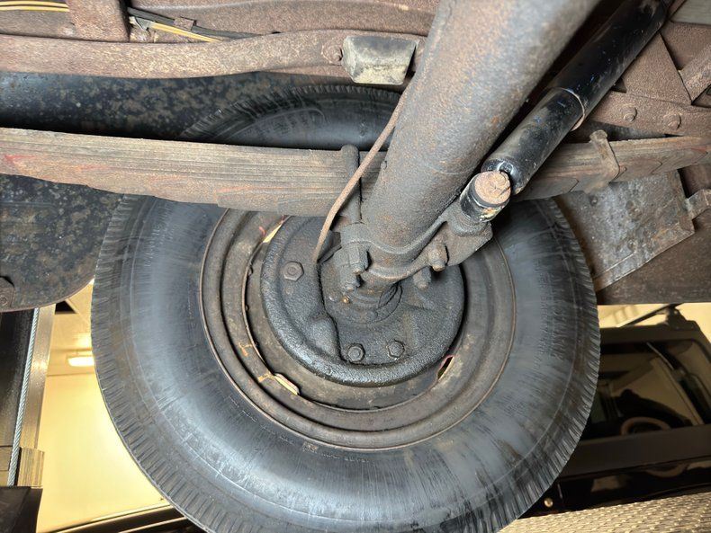 Undercarriage A fine coating of surface rust is seen on all the undercarriage surfaces that have not been oiled either from the engine, or wheel grease. Things remain structurally sound with no rust through, and it appears a recent exhaust system has been installed. Body hangers have surface rust but are still holding strong on the running boards. Leaf spring suspension provides the ride, and drum brakes are on all 4 corners.