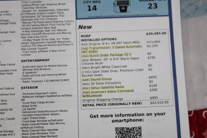 2014 Dodge Challenger SRT Core Edition Coupe. 392 V8, one of just 1,169 ever, only 77 were White, only 57 hardtop coupes were built, a real low production car! Just 70,000 actual miles! Options are 5 speed automatic transmission $1,200, 20 inch Black chrome wheels $795, aax sound $450, Sirius XM Radio $195, brand new rotors drilled and slotted,U-connect voice command with Bluetooth $395, shipping $995, total $43,515. Its perfect with clean CarFax report. I have books, window sticker and CarFax, no accidents. The car only needs a new owner only, the car will run 12.1 in quarter mile at 114 mph. Its priced at $23,995.