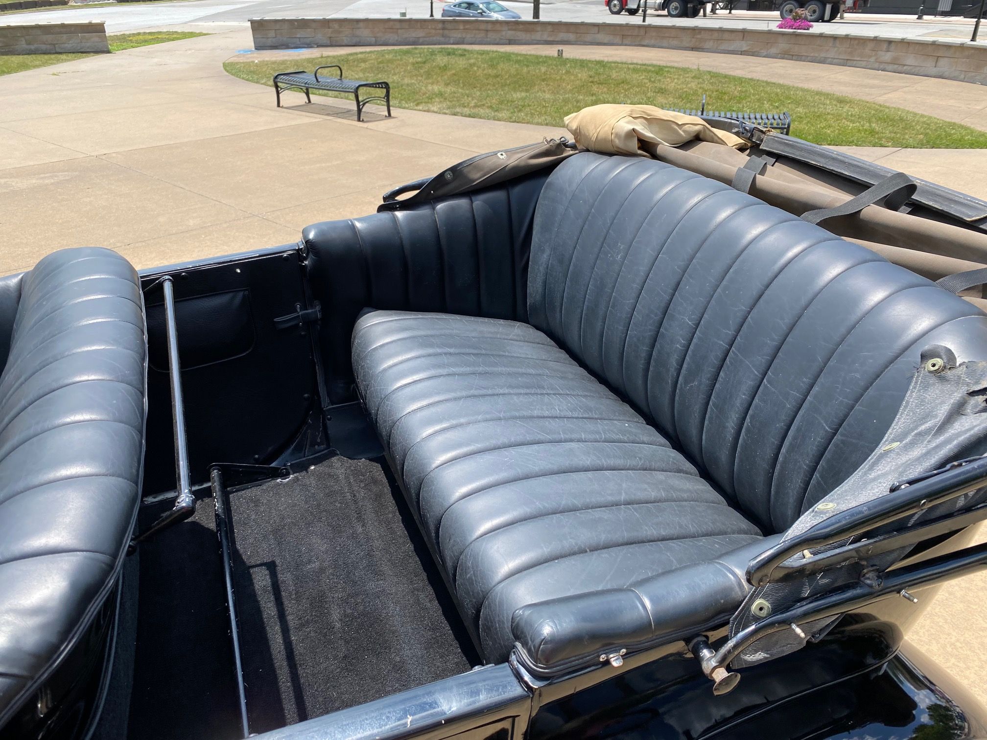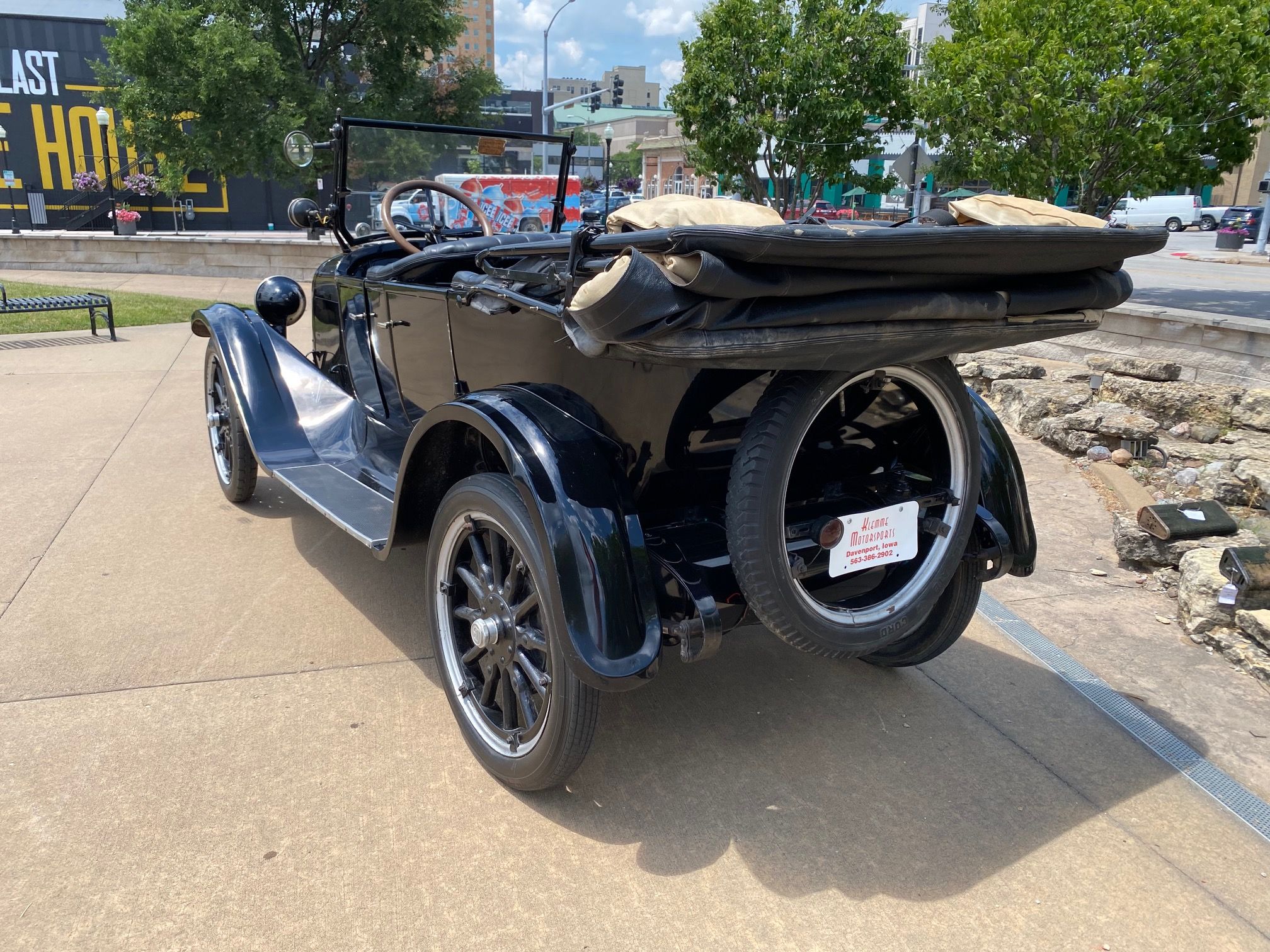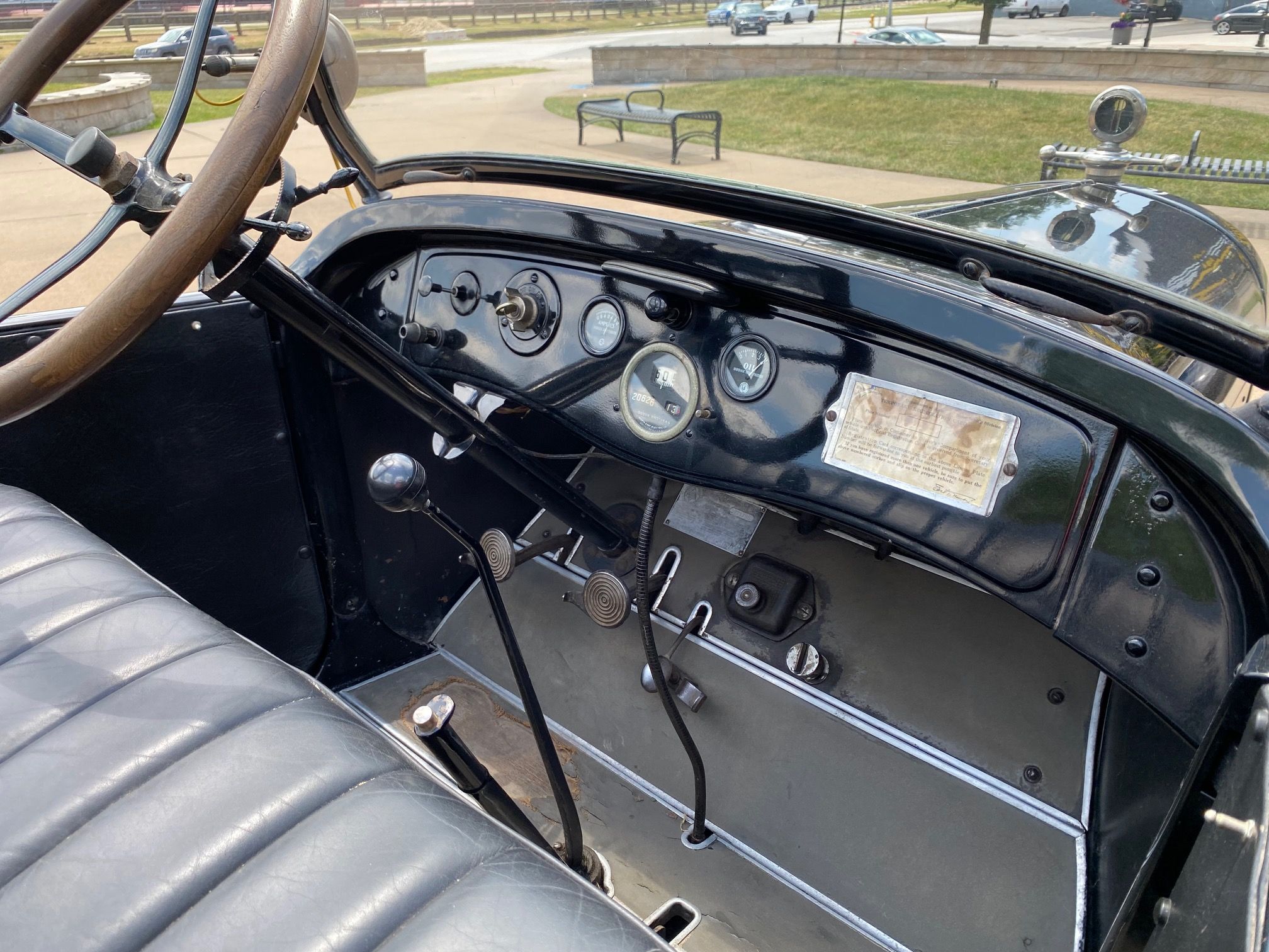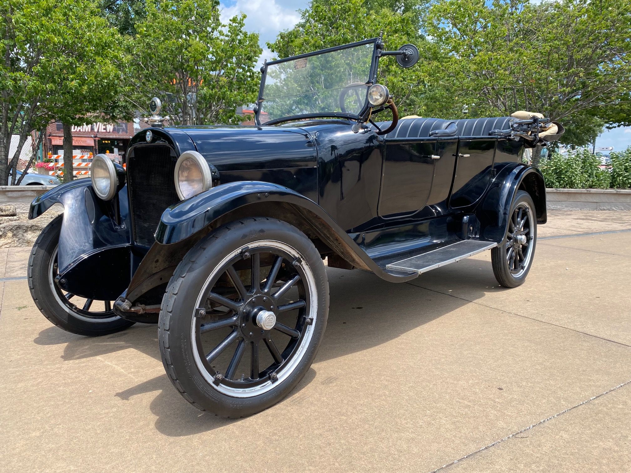 1923 Dodge Brothers Touring Car. Shiny black, good running original 4 cyl, 3 speed manual, nice leather upholstery, wood steering wheel, top needs repaired, rear glass window, side curtains, Monarch accessory spotlight, rear mount spare, original Boyce Moto-meter, Vintage coal footrest heater, 20k miles.