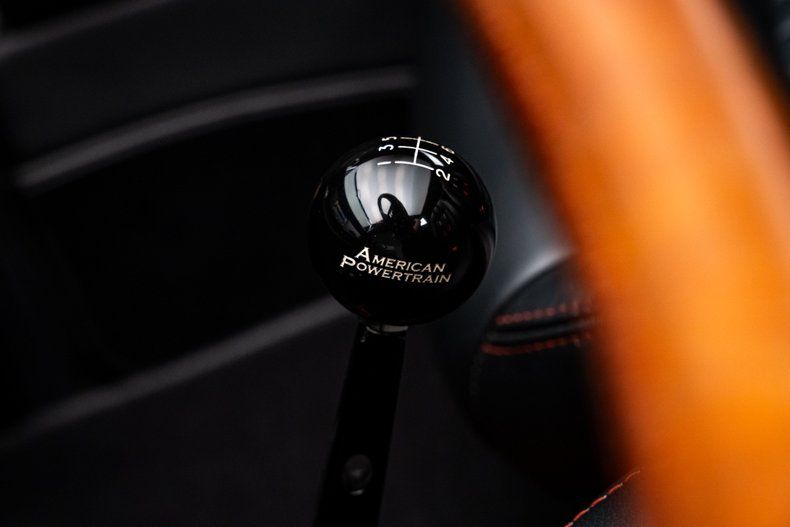 Between the doors, custom leather upholstery takes clean and stylish form thanks to the pros at New London, Ohio's Hide Originals. Six-way adjustable seats feature four-point Crow Enterprizes harnesses that can double as simple lap belts. Those red-stitched buckets frame a custom console featuring a billet American Powertrain shifter. A custom dash centers clean Dakota Digital VHX telemetry over Vintage Air climate control. Custom side panels add nice texture. And the driver spins a leather-wrapped Quick Release Steering Wheel around a raised column that, along with an enlarged footwell, makes this roadster comfortable for drivers of all sizes.