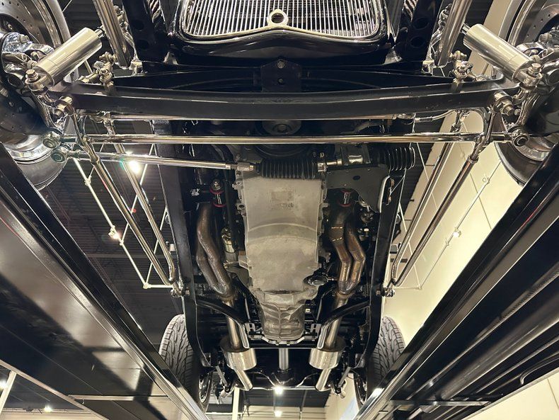 Pull this impressive Ford on a lift and you'll find a completely custom chassis that was created by the same skilled fabricators who prepped the car's all-steel body. Beginning with custom-boxed American Stamping frame rails, Ohio's Boss Performance added custom crossmembers, a custom transmission support, custom stabilizer bars, and custom torsion tube and shock mounts. All that spice rides a triangulated 4-bar rear-clip that's finished with adjustable Viking coil-overs. That clip hosts adjustable Viking shocks around a 2-inch drop axle and 2-inch drop spindles. The Tremec T56 6-speed, featuring a hydraulic clutch from American Powertrains, spins a custom Henderson Driveline driveshaft to a 9-inch Ford axle that's built with a Traction Lok differential and 4:10 gears. Turns come courtesy of a manual Unisteer rack. Stops are provided by manual Wilwood disc brakes. Custom stainless pipes cage throaty Borla mufflers. And at the corners of the car, custom Vintage Wheels Knock-Offs spin 225/50R16 Diamond Back redlines in front of 285/60R18 Diamond Back redlines.