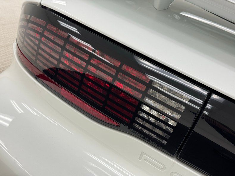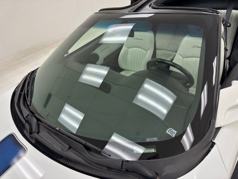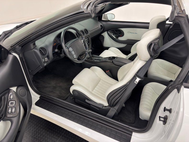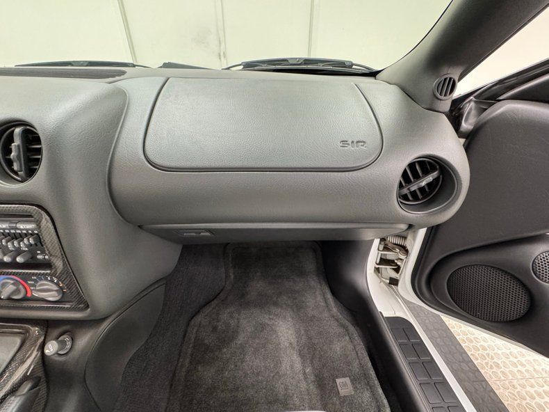 Pristine sculpted door panels appear as though they were shaped by the wind greet us upon opening the doors. They are utilizing white inserts and black molded plastic to form the integrated armrest/door pull/power toggle housing and the speaker, all with the 25th Trans Am badge in the white field. Slipping inside, beautifully sculpted white leather buckets keep the wind swept forming scheme, and these have black tubs they fit within. 2 more of these beautiful buckets are in the back, now separated by the hump and all of this seating appears nearly new with only very light folds to note in the driver's bucket. Racing forward is a center console which has a glovebox, shift lever and cup holder. As the dash rises temp controls and an AM/FM/CD stereo with a built in equalizer is neatly mounted into this central space. A trio of round vents are near the center of the dash top. More windswept sculpting for the instrument cluster which has a beautifully curved arch with analog gauges in the cluster. Charcoal carpeting floods the floors and is very clean, as is the headliner that divides the T-tops. Lest we forget, more embroidery for the headrests noting the 25th Trans Am. Underneath that rear greenhouse glass is a charcoal felted trunk tub and a flat upper storage area.