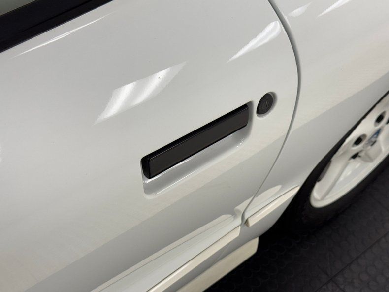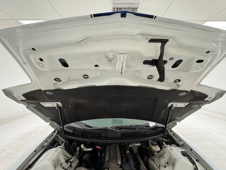 Bright White two stage paint adorn the straight panels of this car with all composite bumpers on the front and rear that come together to form this aerodynamic F-body. A blue decal center stripe adds racy contrast and the "screaming chicken" on the nose pays homage to Trans Am of the past. A rakish front glass framed in black trimmings is at the pause of the blue stripe to make room for the removable smoke glass T-tops on the roof as we work our way to the back of the car. A curved greenhouse rear glass melts into a rear spoiler which matches the curvature of the glass and frames the rear of the car as well, just above another composite bumper is an elongated oval of honeycomb tail lights, another nod to the hexagon heritage of Trans Ams. Tailpipes are peeking out of the rear roll pan and look as though they have been molded into the body. White 5 spoke wheels are on all 4 corners and are wrapped in 245/50ZR16 black walls. Imperfections? Meh. A scuff on the body that can be compounded out, and the typical chin scrapes not visible from above.