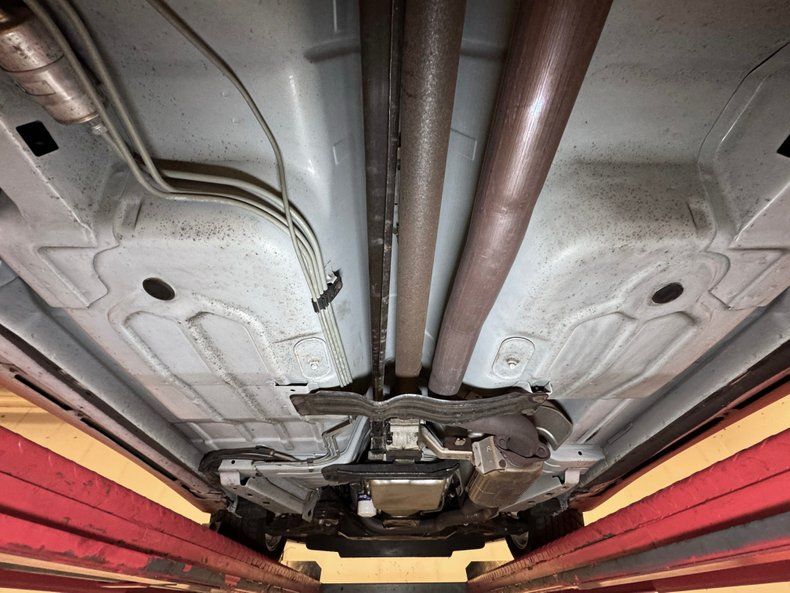 Showroom fresh with only a light peppering of surface rust and very clean floor pans and toe kicks. Otherwise, its miles of grayish white steel for the unibody, flooring and rockers. Independent coil spring suspension for the front, and a torque arm with coil springs for the rear are supplied. The OEM single exhaust with dual tailpipes handle the big exhale and provide the perfect V8 burble.