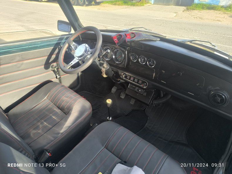 The 1,300 cc 4-cylinder engine produces 63 horsepower, giving this Mini a spirited performance that is further enhanced by road-approved semi-slick tires. The British Racing Green exterior is in excellent condition, and the interior has been completely renovated with premium black leather seats with red French seams, carbon fiber accents, and a custom Paddy Hopkirk steering wheel.