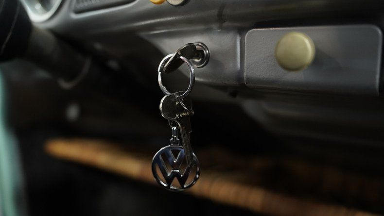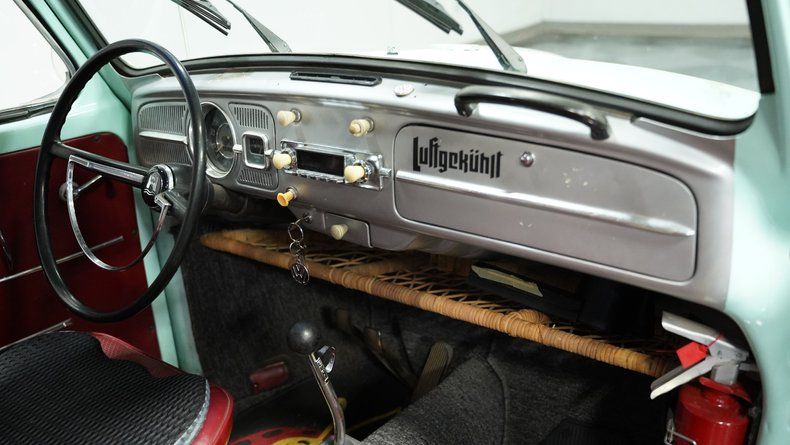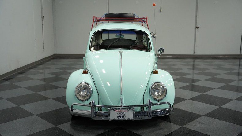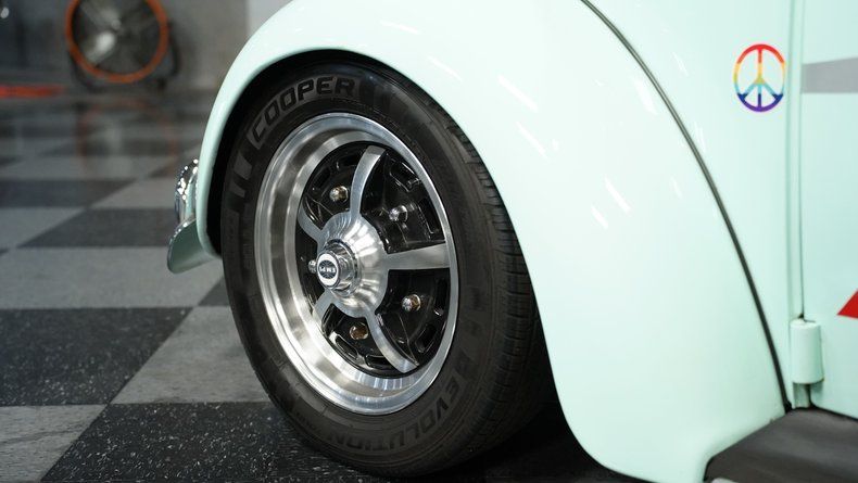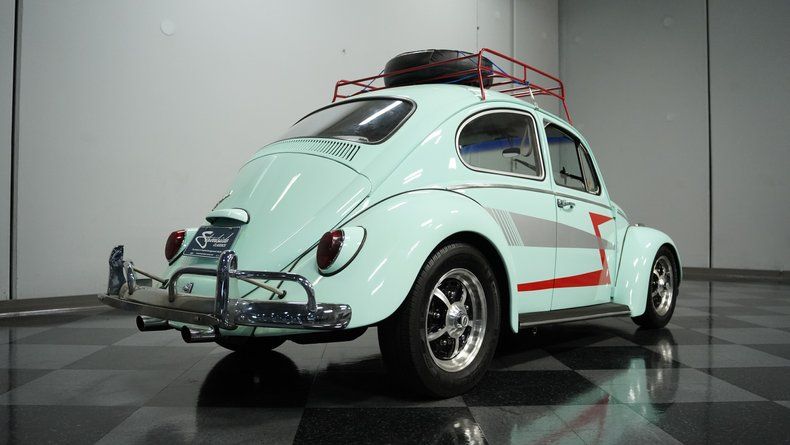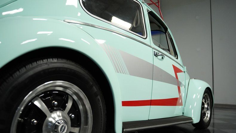 Finished in vibrant teal with racing-inspired red accents, this 1966 Volkswagen Beetle underwent a complete transformation by a skilled paint artisan. The body received full disassembly, metal stripping, epoxy primer, and premium PPG base/clear coat application for a superior finish. The red roof rack and coordinated side stripes give this Bug a rally-inspired appearance that's uniquely its own. Sitting deliberately low on 15" EMPI Sprintstar wheels with polished edges, the 175/65R15 front and 205/65R15 rear tires plant this German classic firmly on the asphalt with a purposeful stance.