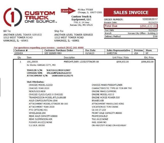 2022 Load King Stinger 80-160 Crane Mounted on a 2022 Freightliner 122SD Introducing the 2022 Load King Stinger 80-160 boom crane mounted on a 2022 Freightliner 122SD, a powerhouse combination for heavy-duty lifting and hauling tasks. The Load King Stinger 80-160 crane offers impressive reach and lifting capacity, making it ideal for construction sites and industrial applications. Mounted on the robust Freightliner 122SD chassis, known for its durability and reliability, this setup ensures optimal performance and safety. Equipped with advanced controls and hydraulic systems, the crane provides precise operation and efficiency, enhancing productivity on the job. Whether tackling complex lifts or transporting heavy loads, the Load King Stinger 80-160 on the Freightliner 122SD represents a pinnacle of strength and versatility in the world of heavy equipment. Like New. Someone can save a lot of money Dolly and wind gage goes with crane. 2 more years of factory bumper to bumper warranty. Always stored inside. Upper hours 500, lower hours 1,200, Idle hours 500. 62' maximum jib length. Located in Kankakee, IL 60901 For more information, please call 833-265-6113 and mention ID 071988