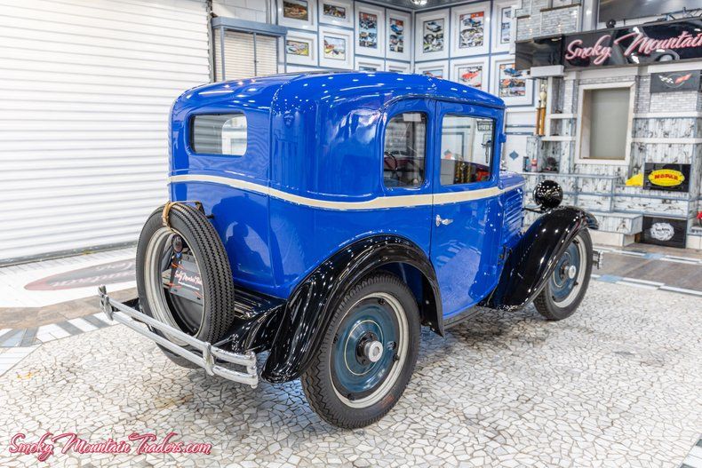 The body has been phenomenally cared for over the years and was redone in the Blue and Black color scheme, accented by the tan stripe down the sides. All the glass is in great condition, and the front windshield tilts out. Both front and rear bumpers are very nice as well. Up front we can see the grill and headlights are very nice, and out back, it has the spare tire and center brake light. It's sitting on the factory-style wheels with Goodyear tires. On the inside, it's done in classic blue with matching seats and door panels. It's got the factory-style steering wheel and rubber American Austin Floor mat. Looking at the dash, all the gauges and metal looks to be in great condition. Under the hood it's powered by the 4 Cylinder 750CC Flat Head Engine. It still has the 6 Volt system. It comes with the standard optioned 3 Speed manual.