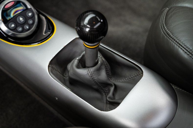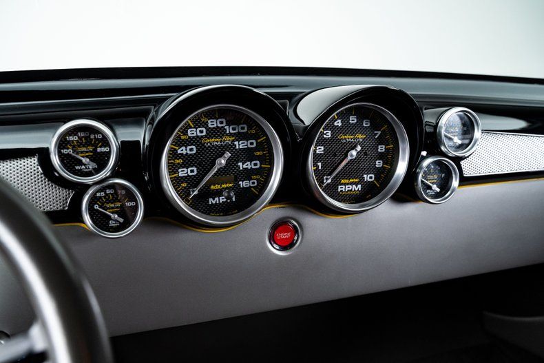 Inside, the attention to detail continues. Charcoal leather upholstery by Paul Atkins is complemented by satin grey finishes and yellow pinstriping that traces across the hand-fabricated dash and door panels. The dash features a center-mounted gauge cluster housing AutoMeter gauges, perforated metal accenting, and push-button ignition. A custom waterfall center console carries over the yellow pinstriping and houses a carbon fiber shifter and radio controls. A tilting ididit column and custom Billet Specialties wheel complete the driver's setup. Air conditioning is seamlessly integrated, with its controls cleanly hidden beneath the dash to maintain a clutter-free aesthetic.