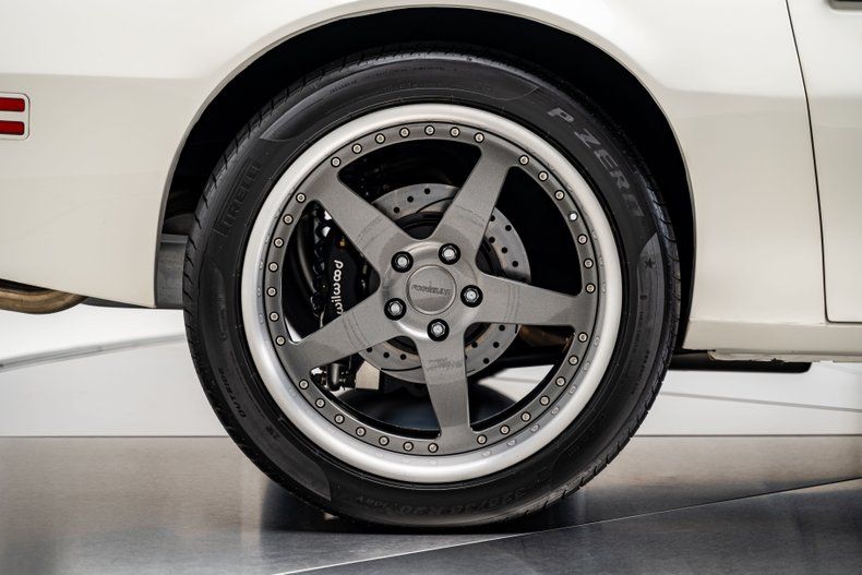 The body was stripped and reworked with new sheet metal where needed, including freshly mini-tubbed rear quarters, and refinished in a sharp white hue that pays tribute to the car's original Cameo White build. Flush-fit front and rear glass adds a modern edge without disrupting the mostly stock-appearing trim, which still includes original-style bumpers, turn signals, sport mirrors, and the signature nostril-style hood scoops. The Firebird sits with purpose on staggered 19-inch front and 20-inch rear Forgeline S03P wheels wrapped in sticky Pirelli P-Zeros, 285mm up front and 325mm out back.