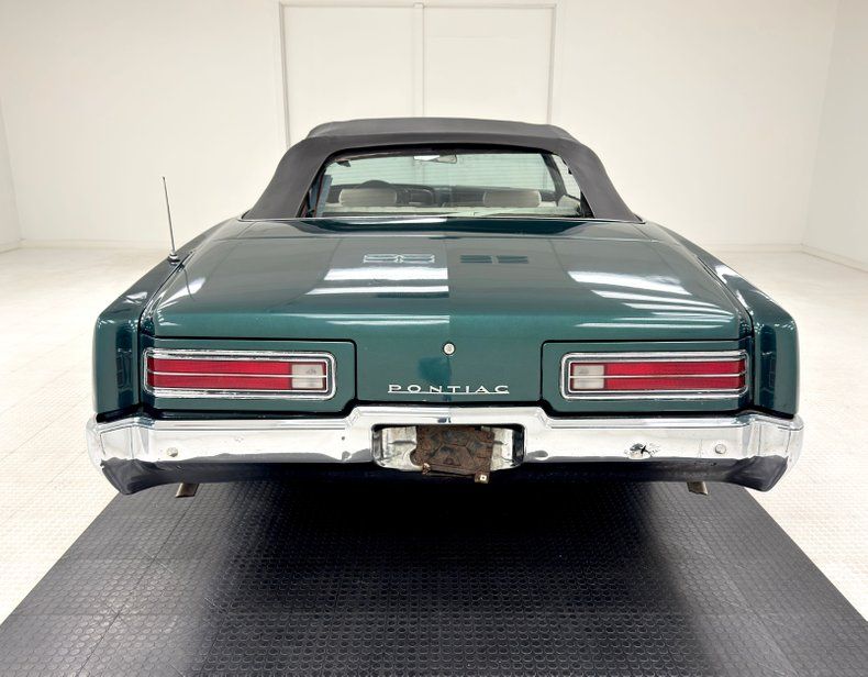 This impressive land yacht wears a coat of two stage Emerald Green Metallic over long panels and an extended overhang past the rear axle. The face portrays Pontiac's familiar beak design which extends the center of the grille that comes to a point, capped by the arrowhead of course, and flanked by dual headlights on each side. At the end of the wide, flat, and vented decklid are simple tail lights that vary little from GM's other offerings in this period, here bookended by extended fenders that hint of fins without going all out. 15-inch steel wheels are topped with correct hubcaps and wrapped in 75 series white walls with the thin band of white common in this era. The black canvas top is in good shape, but the glass window is loose and subject to some duct tape repair. Other imperfections include some fading paint around the tail light bezels, orange peel in the paint, and some bubbling on a lower panel.