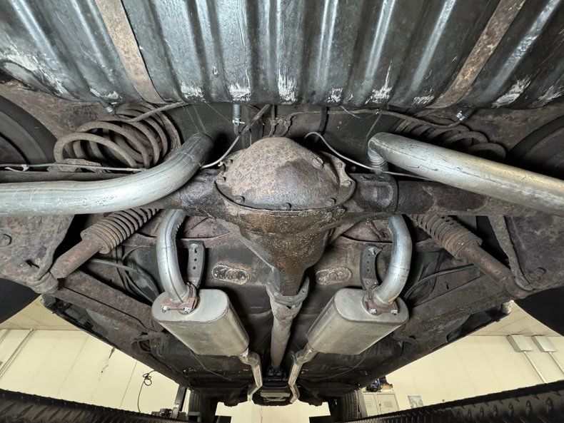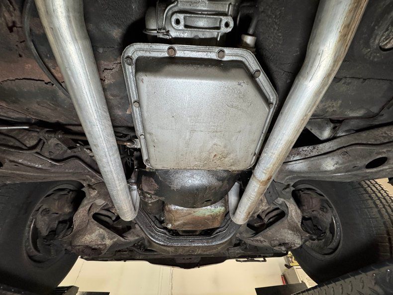 We hoist the green giant onto the lift and find a used by not overly dirty underside. There's surface rust, oil on the pan, caked on grease, and even some rust through on underside panels, but overall less tired than we expected. The dual exhaust stands out as newer as the pipes run through stainless steel mufflers and exit discreetly before the rear bumper. Suspension is made up of coil springs up front and a 4 link with coil springs in back.