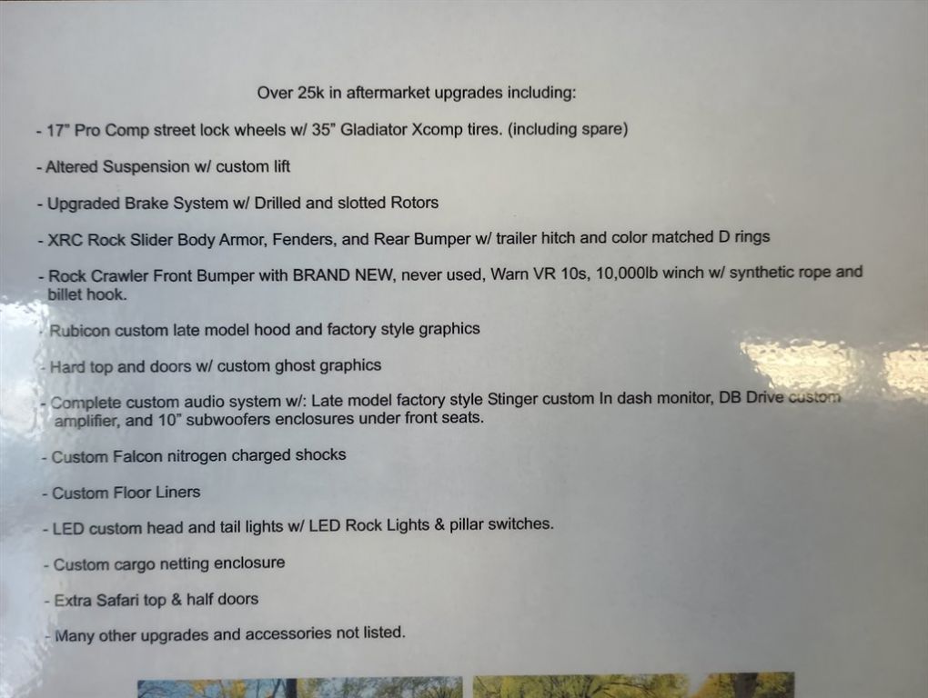 2012 Jeep Wrangler Unlimited Rubicon 4wd 64,863 actual miles, 3.6 l V6 engine, 6 speed manual transmission, power windows, power locks, air conditioning, four wheel drive, tilt steering column, power mirrors, over $25,000. In aftermarket upgrades including, 17 inch ProCom Street lock wheels with 35 inch Gladiator Xcomp tires including spare, Altered Suspension with custom lift, Upgraded Brake system with drilled and slotted rotors, XRC Rock Slider Body Armor, fenders and rear bumper with trailer hitch and color match d-rings, Rock Crawler front bumper with BRAND NEW never used worn VR 10s, 10,000 lb winch with synthetic rope Billet Hook., Rubicon custom late model hood and factory style graphics, hardtop and doors with custom ghost graphics wrap, complete custom audio system with late model factory styles Stinger custom in dash monitor, DB drive custom amplifier, and 10 inch subwoofers enclosed under the front seat. Custom Falcon nitrogen charged shocks, Custom floor liners and more. Bright Accents,AIR Conditioning,Passenger Assist Handle(S),Rear Assist Handle(S),Digital Media Auxiliary Jack Audio,CD Audio - CD/MP3,MP3 Audio - CD/MP3,WMA Playback Audio - CD/MP3,130-Watt Audio - Radio,368-Watt Audio - Radio,AM/FM Audio - Radio,Amplifier Audio - Speakers,Infinity, 6 Audio - Speakers,Subwoofer(S) Audio - Speakers,Carpet Cargo Area,Hooks, TIE Down Cargo Area,MAT Cargo Area,Carpet,Floor Consoles,Full Length Consoles,Tray Consoles,Compass Displays,LOW Fuel Indicator Displays,OIL Pressure Displays,Outside Temperature Displays,Seat Belt Reminder Displays,Carpet Floor Mats,Front & Rear Floor Mats,Odometer Instrument Panels,Speedometer, 100-MPH Instrument Panels,Tachometer Instrument Panels,Trip Odometer(S) Instrument Panels,Voltage Instrument Panels,Dome, Rear Lights,Manual Dimming Mirrors,Rearview Mirrors,Door Power Locks,115-Volt Power Outlet(S),12-Volt Power Outlet(S),Fuel Filler Door, Capless Remote Releases,Height, Adjustable Seats - Driver,Adjustable Seats - Front,Buckets, LOW-Back Seats - Front,Reclining Seats - Front,60/40 Split-Folding Seats - Rear,Bench Seats - Rear,Tilt Steering Column,Controls, Audio Steering Wheel,Leather-Wrapped Steering Wheel,BIN(S) Storage,Covered Storage,Glovebox, Lockable Storage,Pockets, Seatback Storage,Rear Storage,Under Floor Storage,Sirius, 1 Year Subscriptions,Sentry KEY Theft Deterrent Systems,Shift Knob, Leather W/Chrome Trim,Cloth Upholstery,Mirror Visors,Sliding Visors,Fasten Seatbelt Warning Chimes,Headlights ON Warning Chimes,KEY-IN-Ignition Warning Chimes,Power Windows,Fixed Antenna,Badging,Color-Keyed Bumpers,Front Bumpers,Rear Bumpers,Full-Metal Doors,Removable Doors,Flares, Accent Fenders,FOG Lights,Deep Tint Glass,Tint, Windshield Glass,Body-Color Grille,Automatic Headlights,Halogen Headlights,Insulation Hood,Heated Mirrors,Power Mirrors,Monotone Paint,Front & Rear Recovery Hooks,Soft TOP, Folding W/Sunrider Roof,Color-Keyed Roof Rack/Rails,Protective Coating Roof Rack/Rails,255/75r17 Tire Size,Full-Size Tire Size - Spare,BF Goodrich Tires,ON/OFF Road BSW Tires,Tire Carrier W/Winch Tires,Fuel Tank Underbody,Skid Plate(S) Underbody,Transfer Case Underbody,Aluminum, Painted Wheel Material,17 X 7.5 Wheel Size,Full-Size Wheel Size - Spare,Variable Intermittent, Front Wipers,3-Point Seat Belts IN ALL Positions,Advanced Airbag - Driver,Multi-Stage Airbag - Driver,Seat Mounted Airbag - Front Driver Side,Advanced Airbag - Front Passenger,Multi-Stage Airbag - Front Passenger,Seat Mounted Airbag - Front Passenger Side,Occupant Classification System Airbag - Occupant Sensor,Latch Child Seat Anchors,Adjustable Head Restraints,Outboard Head Restraints,Engine Immobilizing System,Tire Pressure Monitors,Remote Keyless Entry,Sport BAR Rollover Protection,Constant Force Retractors (CFR) Safety Belt Systems,Alarm Security Systems,ALL-Speed Traction Control,Electronic Stability Control (ESC) Traction Control,Rollover Mitigation Traction Control,160 Alternator - Maximum Capacity (Amps),600 Battery - CCA @ 0 F,Single Piston Brake Calipers,4-Wheel, Disc Brakes,Booster, Active Brakes,Hydraulic Brakes,Power-Assisted Brakes,Quick Brake Assist Brakes,Brakes - ABS,Disc, Vented Brakes - Front,Disc, Solid Brakes - Rear,Cruise Control,Part-Time 4wd, Rock-Trac Drive System,50 State Emissions,Damper Steering,Power Steering,Recirculating Ball Steering