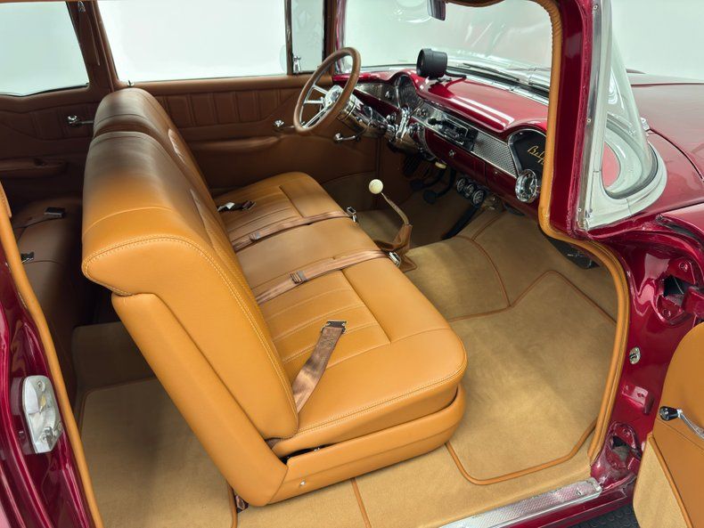 Handsome saddle leather is stretched over the inner doors and patterned with a pleated, smooth body, and carpeted corner kick panel. The same supple leather covers the split bench seat up front with matching plastic shell and perfect rear seat. Attention to detail is evident in the steering wheel rim, also saddle leather wrapped around billet spokes on a polished tilt column leading to an apple red dash in stock configuration to include the bowties stamped mid panel. Augmentations include a tachometer on top of the dash, an AM/FM/Cassette radio in the center, and a tripod of gauges under the dash. Beautiful light brown carpet and mats are edged in saddle, front and rear, and the trunk is finished with all the same materials and is show worthy on its own! The headliner? More saddle leather! Wow.