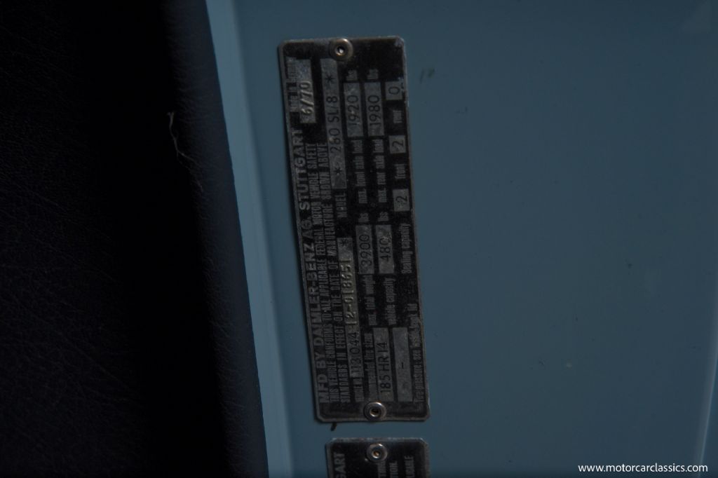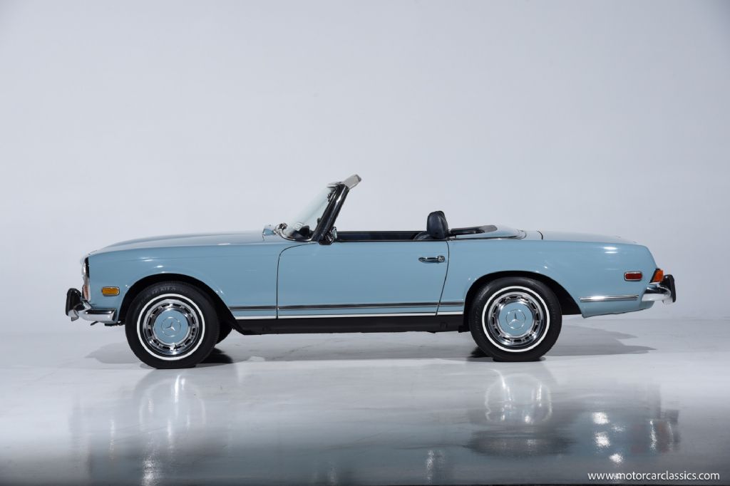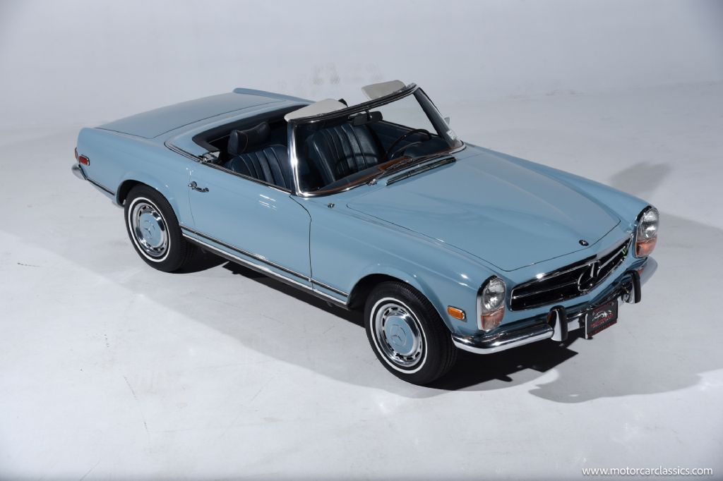 1971 Mercedes-Benz 280SL for sale! Motorcar Classics is proud to present this stunning 1971 Mercedes-Benz 280SL. It is a superb example of one of the Mercedes W113 Pagoda, among the most iconic grand tourers ever produced. Finished in the rare and beautiful 304G Horizon Blue, this US-market Pagoda features its matching hardtop, navy blue soft top, and a pristine navy blue MB-Tex interior, all exactly as it left the factory. Equipped with power steering and an automatic transmission, this 280SL delivers effortless driving with the comfort and refinement expected of a Mercedes classic. The original Becker Europa radio remains in place, preserving the authentic ambiance of the cockpit. For decades, this car remained in the family of its original owner, a testament to its cherished provenance. The restoration was carried out by the owner's son, a Mercedes marque expert, who performed a meticulous nut-and-bolt rebuild. A 2" thick binder includes detailed receipts for the restoration that was done about ten years ago. The car was subsequently sold to a Mercedes Club judge and the car won a MBCNA concours. There is no evidence of rust or corrosion anywhere on the carunderbody, chassis, or body panelsunderscoring its exceptional preservation. The trim matches the factory ID tag, and the finish is true to the original specifications. The 280SL is widely regarded as the pinnacle of the Pagoda series, combining elegant design, robust engineering, and timeless appeal, making it a cornerstone of any serious Mercedes collection. This Horizon Blue example is a rare find, blending outstanding originality with expert restoration, comprehensive documentation and family history, offering a unique opportunity to own a benchmark classic in the finest condition.