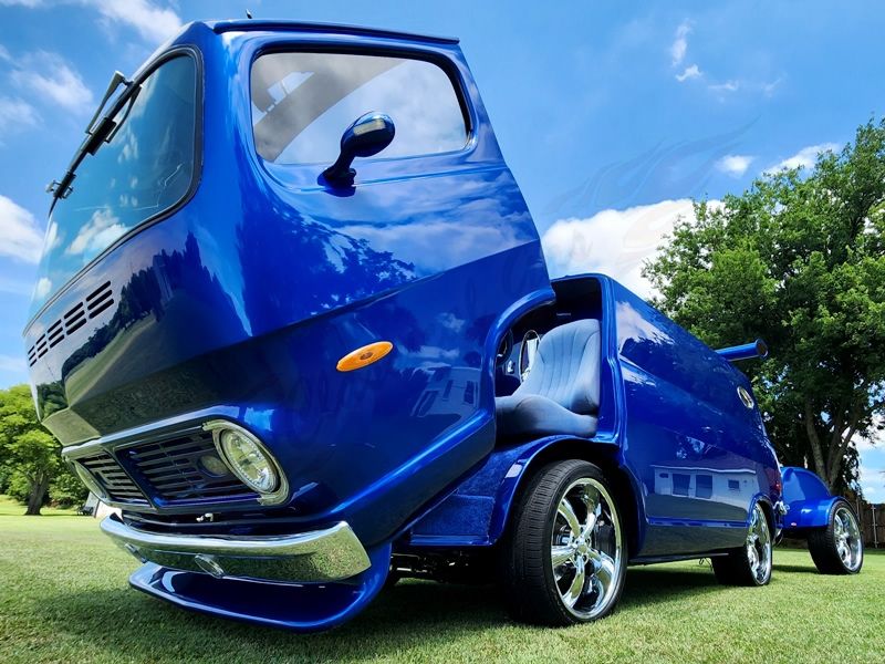 The tilt front cab is already cool enough but inside the fun keeps on going. It has a custom doghouse cover for the motor and custom console with a Hurst shifter. The dash is all custom as well and beautifully painted. It is topped with Dakota Digital gauges, Vintage Air AC controls, custom vents and a chrome glove box door. The dual bucket seats are very nicely upholstered and in excellent condition. Behind the seats are all custom panels creatively created out of sheet metal from other vans. Up above there is a custom sunroof and a handcrafted overhead console with CB radio. Included in the purchase is a matching pull behind trailer that was all custom built as well.