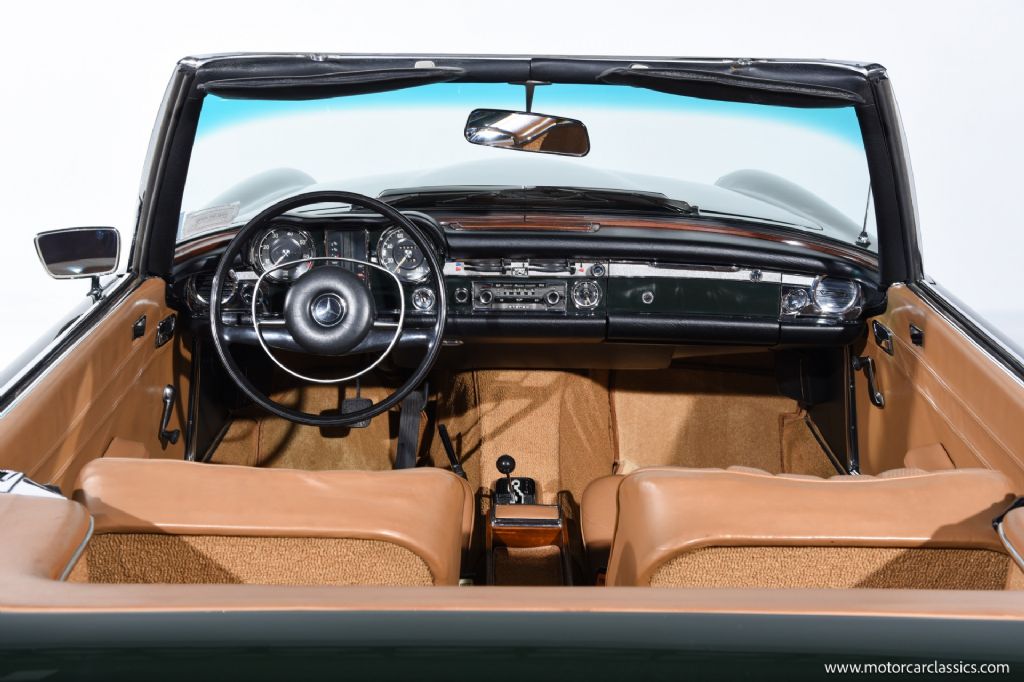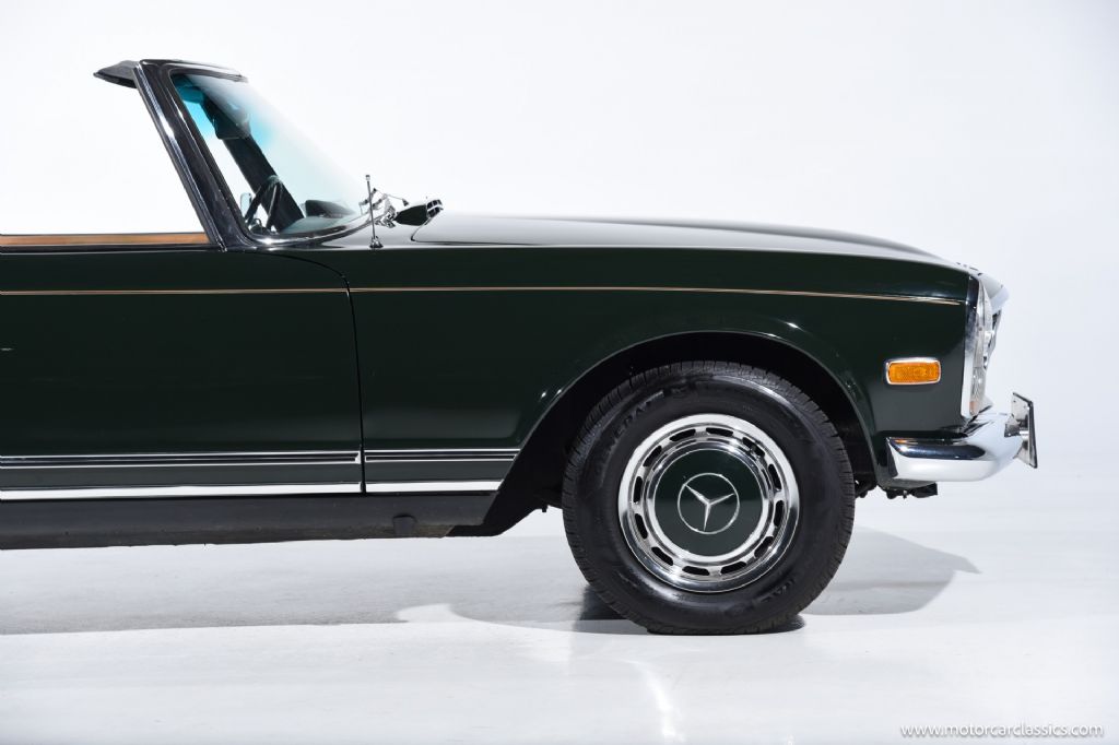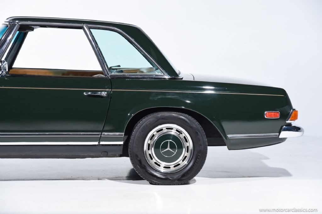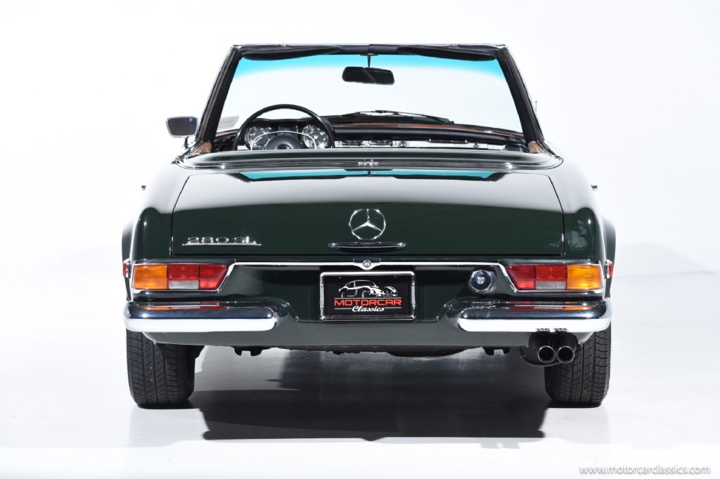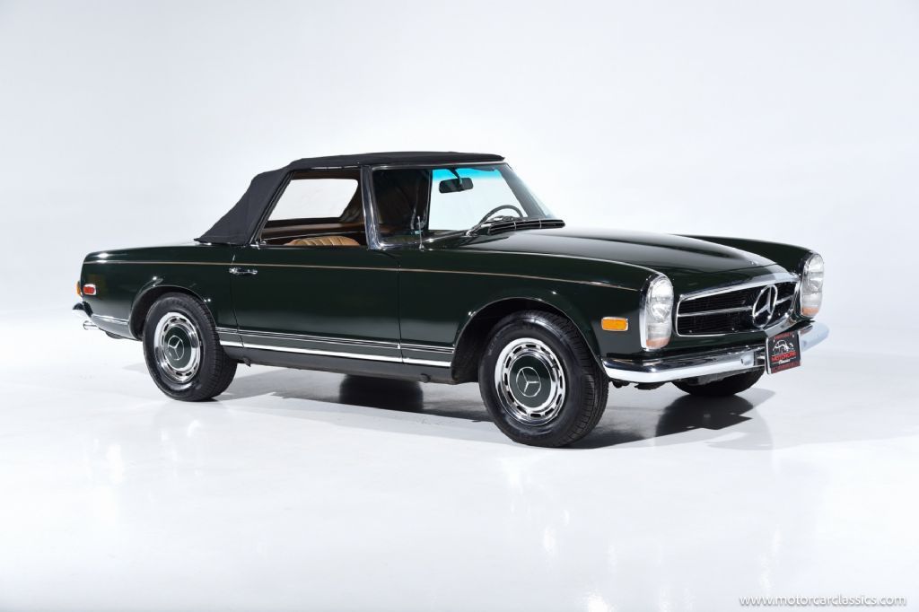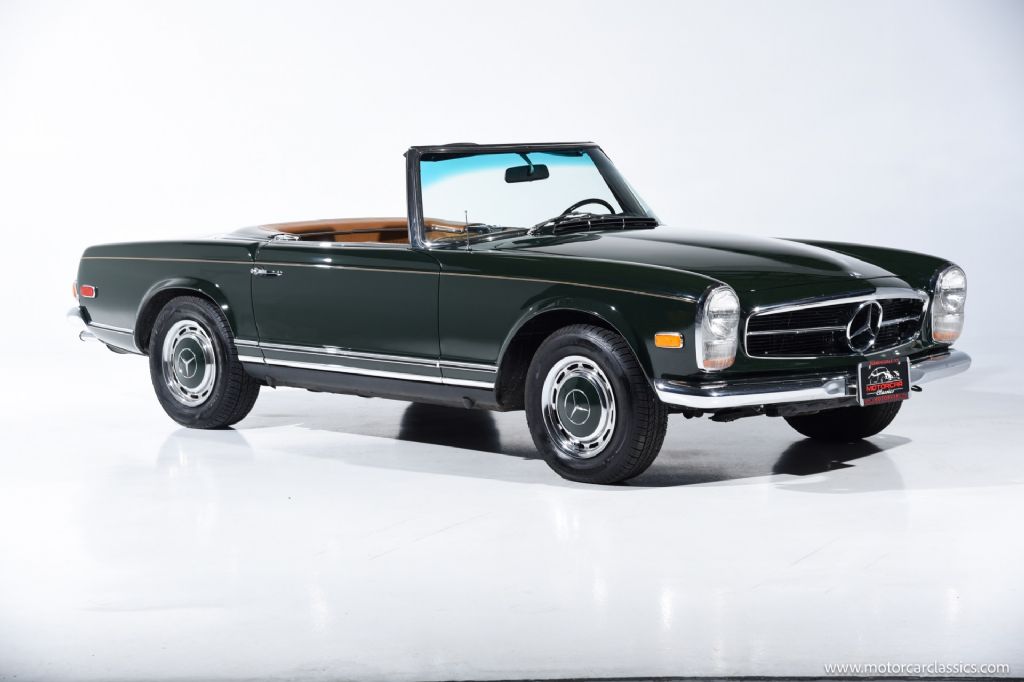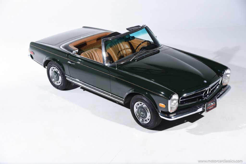 1968 Mercedes-Benz 280SL for sale! Motorcar Classics is proud to present a truly exceptional 1968 Mercedes-Benz 280SL, finished in a striking dark green exterior complemented by a luxurious cognac interior, and paired with a matching dark green hardtop and a black convertible top. This example has undergone a comprehensive restoration to the highest standards, and recent servicing, making it an outstanding investment-grade vehicle for the discerning collector.