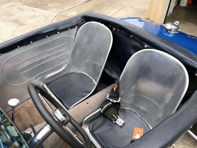 Inside it is very minimalistic with metal hot rod bomber seats with cushion seat bottoms. The dash is painted Blue and topped with aftermarket Black gauges. There are various toggle switches with a NOS switch on the right side. On the floor is mounted a Lokar shifter.