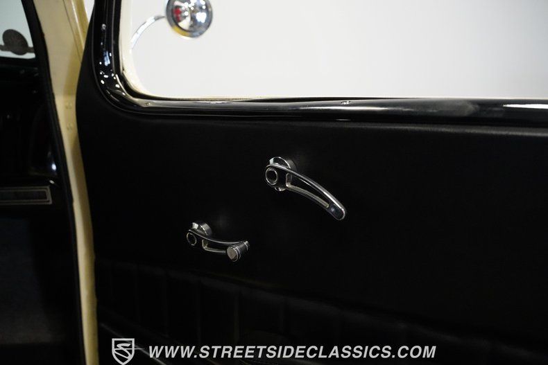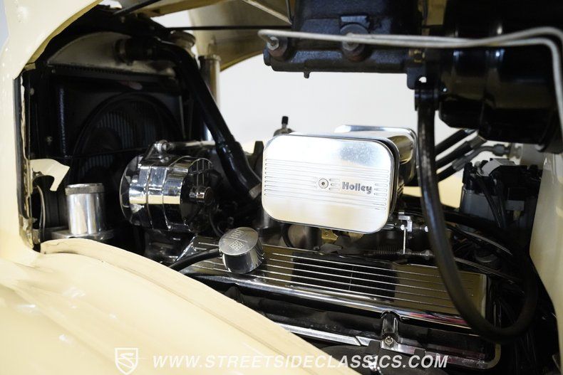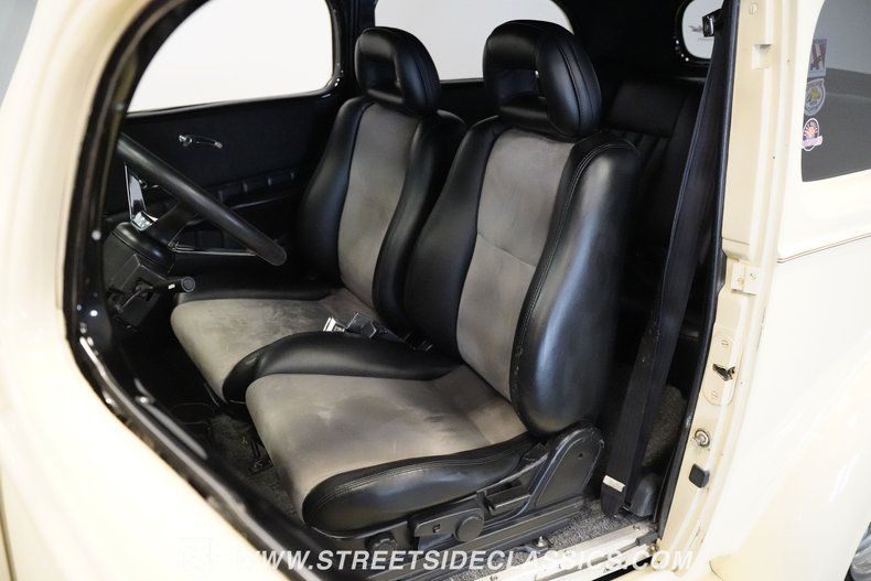 Custom modifications abound on this rare 1936 Chevrolet Master, painted in cream and enhanced with detailed pinstriping across its body. The front fenders house integrated headlights for a cleaner look, while the blacked-out grille adds contrast to the exterior. The door handles have been shaved for a smoother appearance. Several upgrades include a one-piece windshield, integrated gas cap, and unique tail lights that set it apart. The 15" American Racing aluminum wheels are fitted with 205/75R15 Uniroyal Tigerpaw tires that grip the road effectively.