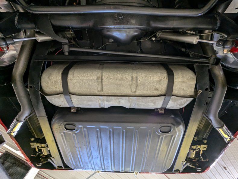 UNDERSIDE: Totally restored! The front end was gone through and rebuilt with lots of new parts, bushings, and hardware. 2" drop spindles were added for a nice rake and ideal stance. The upgraded airbag system allows you to adjust the ride height with the push of a button and slam it almost to the ground when parking. It also has upgraded Ridetech Fox HQ shocks plus front and rear swaybars as well. Very nice Wilwood disc brakes at all 4 wheels with slotted & drilled rotors and new lines too. The dual exhaust system was totally redone with o2 sensors and Glaspack style mufflers. Looking up at the engine everything is nice and clean with an aluminum oil pan. The 4L60E automatic overdrive transmission also looks fresh and has a tubular cross member and a new mount. The rebuilt and balanced driveshaft leads back to a Ford 9" rear end with panhard bar. The floors are solid and rust free with neatly applied satin black paint.