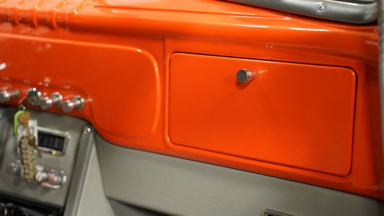 The orange and gray leather interior transforms the once-utilitarian cabin into a comfortable, contemporary driving space. Power bucket seats provide modern comfort while Dakota Digital VHX gauges display vital information with crystal clarity. The polished tilt column adds a touch of flash, complemented by an aftermarket console with cup holder for long-haul convenience. Modern amenities include power windows, power locks, cruise control, and vintage air conditioning to keep things cool. The AM/FM CD player with USB connectivity provides soundtrack options for every journey in this stylish cabin.