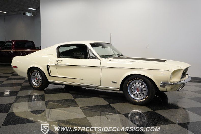 This 1968 Ford Mustang GT J Code Fastback, a true muscle car legend, roars with a Crisp White exterior that gleams under sunlight. The odometer shows just 52,620 and is believed to be original. This rare Mustang was maintained by the same family for four generations, and its outstanding condition reflects the great care it has received over the years. The fastback profile exudes raw power, accentuated by GT fog lights and side louvers that collectors love. Factory GT Mustang styled steel wheels provide a perfect blend of vintage aesthetics and muscle car flavor. The wheels are wrapped with P235/60R14 BF Goodrich Radial T/A tires that provide ample grip for this classic. The GT stripe kit adorns the sides, emphasizing the car's muscular lines.