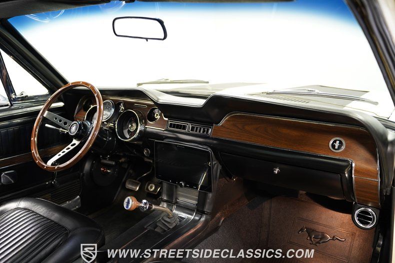 Inside, black vinyl bucket seats welcome you to a cockpit built for performance. The deluxe interior is a blend of restored and well-preserved original components. A floor shifter stands ready for action, connecting you directly to the 4-speed manual transmission. The fold-down rear seat adds versatility to this muscle car. The clean, uncluttered dashboard houses the original gauges, as well as a cool Stewart-Warner tachometer, and Planet Audio touchscreen radio offering a clear view of vital information as you unleash this pony car's power. Other interior amenities include modern air conditioning, upgraded sound system, factory overhead console, and an upgraded tilt steering column with wood-rimmed steering wheel.