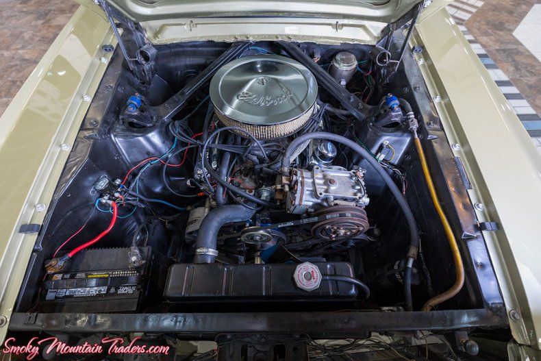 Powering this Mustang is a stout Ford 289 V8 engine, topped with an Edelbrock chrome air cleaner and valve covers for extra flash. The engine bay is clean and well-sorted, featuring a modern battery, updated wiring, and classic Ford performance touches.