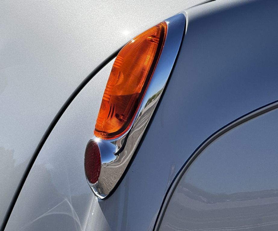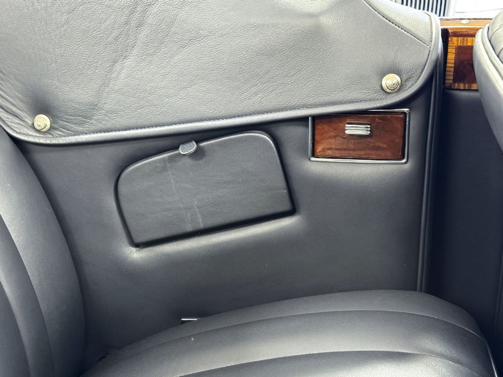 The beautiful interior features Dark Blue Connolly leather that is in excellent showroom condition. Park Wards famous burl walnut and light crossband woodwork is gorgeous and appears perfect. The complementary Light Grey Wilton wool carpet is in excellent condition. During restoration, AC was installed with vents in the rear behind the backseat. All of the instrumentation and original AM radio are in excellent condition.